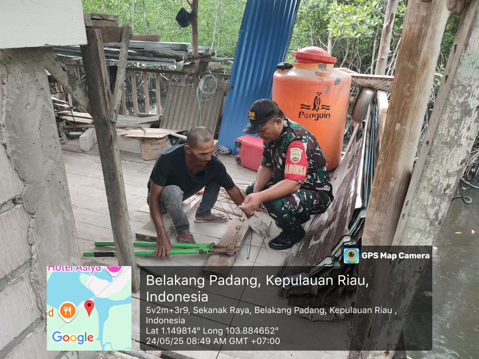 Selanjutnya babinsa berpesan dan membantu warga yang sedang bekerja memperbaiki dapur rumah yang mana tiangnya sudah di ganti dengan beton dan mengganti lantai rumahnya dengan beton. Babinsa selalu mengingatkan supaya berhati hati dalam bekerja, jangan sembarangan membuang sisa sisa bangunan ke dalam laut supaya selalu di rapikan.