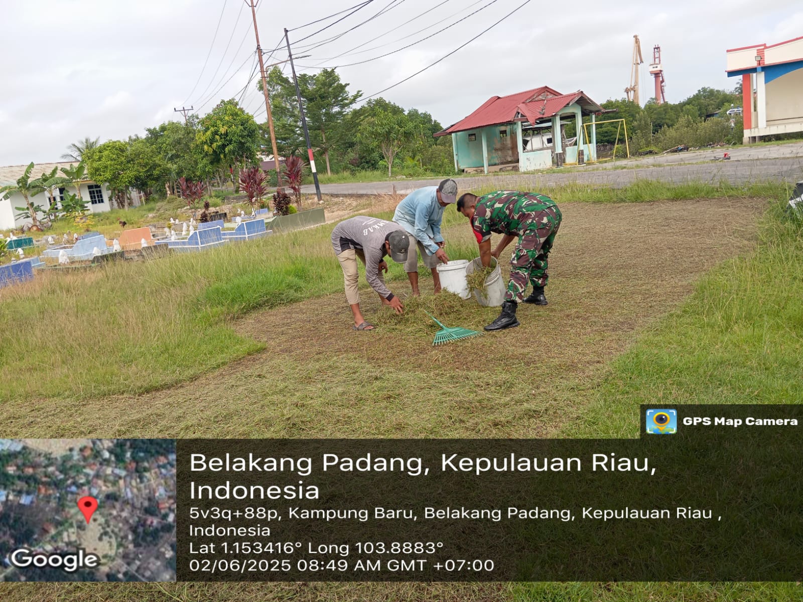 Dalam kegiatan komsos dan monitoring wilayah binaan Babinsa menyambangi para petugas sukarela TPU Kampung Baru yang sedang melaksanakan kegiatan pembersihan do seputar TPU, selain pembersihan rutin kegiatan ini juga akan di lakukan setiap menjelang Idul Adha.