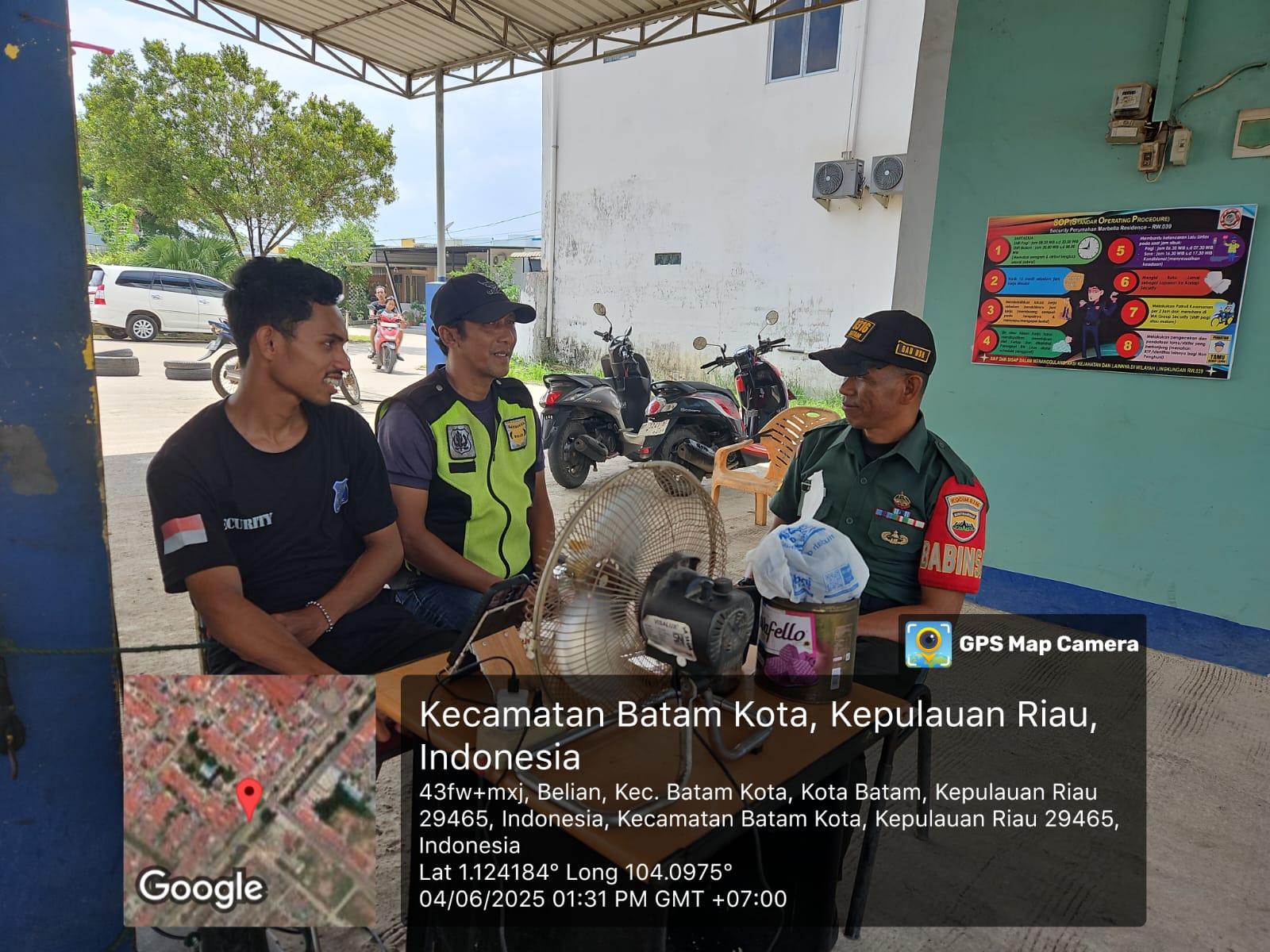 Kodim0316] Babinsa 06 Kelurahan Belian Koramil 03/Nongsa Melaksanakan kegiatan komsos dengan petugas keamanan yang bertempat di Perumahan Marbella Residence RW 039 Kelurahan Belian Kecamatan Batam Kota.Rabu [04/06/2025].