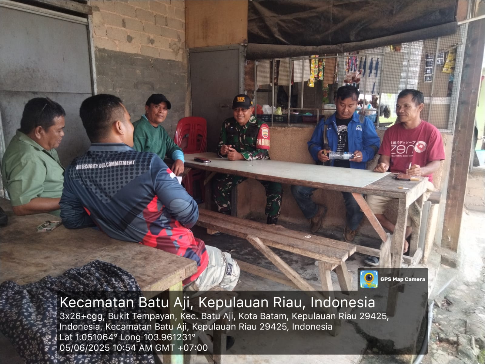 Kodim0316] Babinsa 14 bukit tempayan Koramil 02/Sekupang Sertu Mukhtar melaksanakan kegiatan komsos bersama warga binaan bertempat di warung bapak T.Manurung kampung Damai kelurahan bukit tempayan Kec Batu Aji .Kamis [05/06/2025].