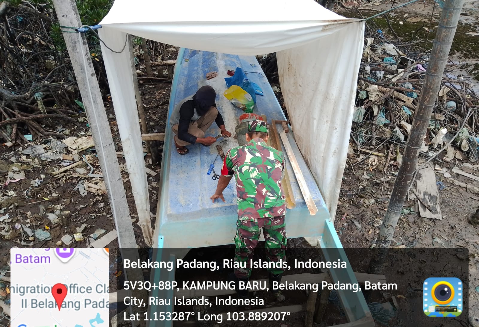 Kodim0316] Babinsa 06/Kasu.Serda O.Banjarnahor menyambangi warga sekaligus melaksanakan Komsos,dan turut serta dalam membantu warga yang sedang memperbaiki Boat sebagai alat tangkap Nelayan Bertempat di Kampung Baru Kel.Sekanak Raga.Kec.Belakang Padang. .Jum’at [06/06/2025].