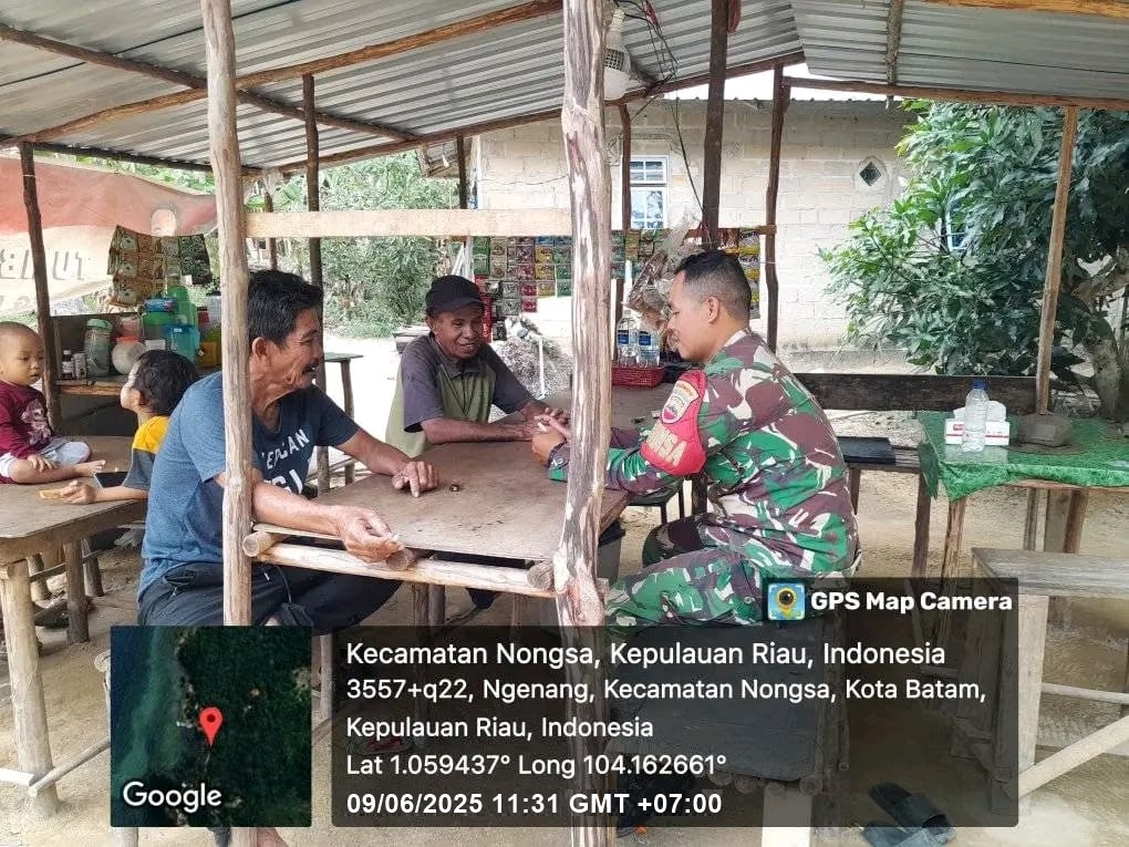 Kodim0316] Babinsa 08 Kelurahan Ngenang, Sertu Alexsander, melaksanakan kegiatan Komunikasi Sosial (Komsos) bersama warga binaan, bertempat di kedai milik Bapak Khaidir, Pulau Tanjung Sauh, Kelurahan Ngenang, Kecamatan Nongsa.Senin [09/06/2025].