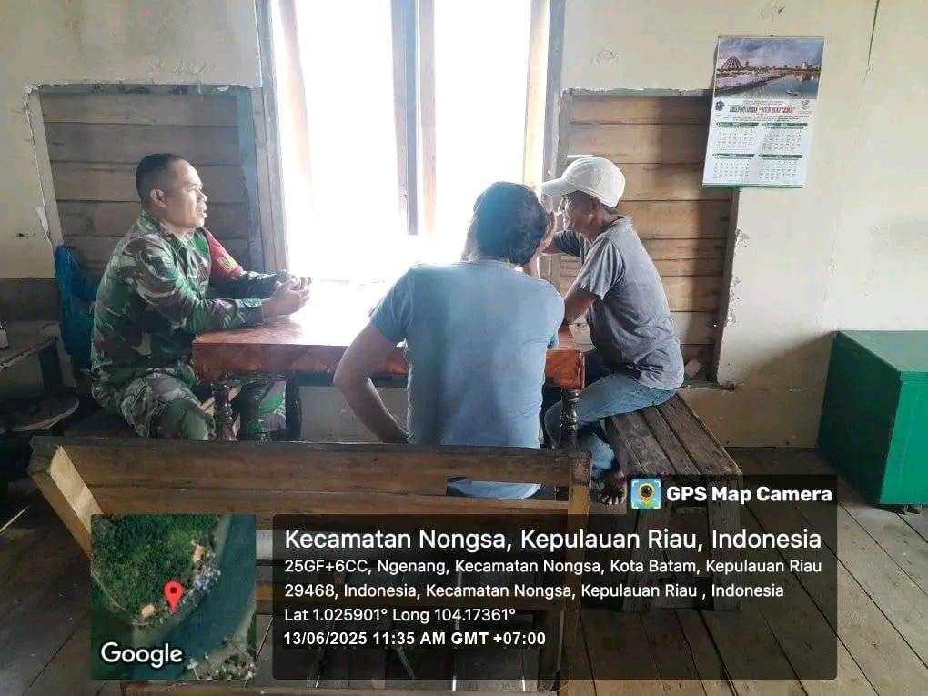 Kodim0316] Babinsa 08 Kelurahan Ngenang Koramil 03/Nongsa, Sertu Alexsander, melaksanakan kegiatan Komunikasi Sosial (Komsos) bersama warga binaan yang bertempat di rumah Bapak Hamid, RT 01 RW 02, Pulau Ngenang, Kelurahan Ngenang, Kecamatan Nongsa, pada hari Jumat (13/06/2025).