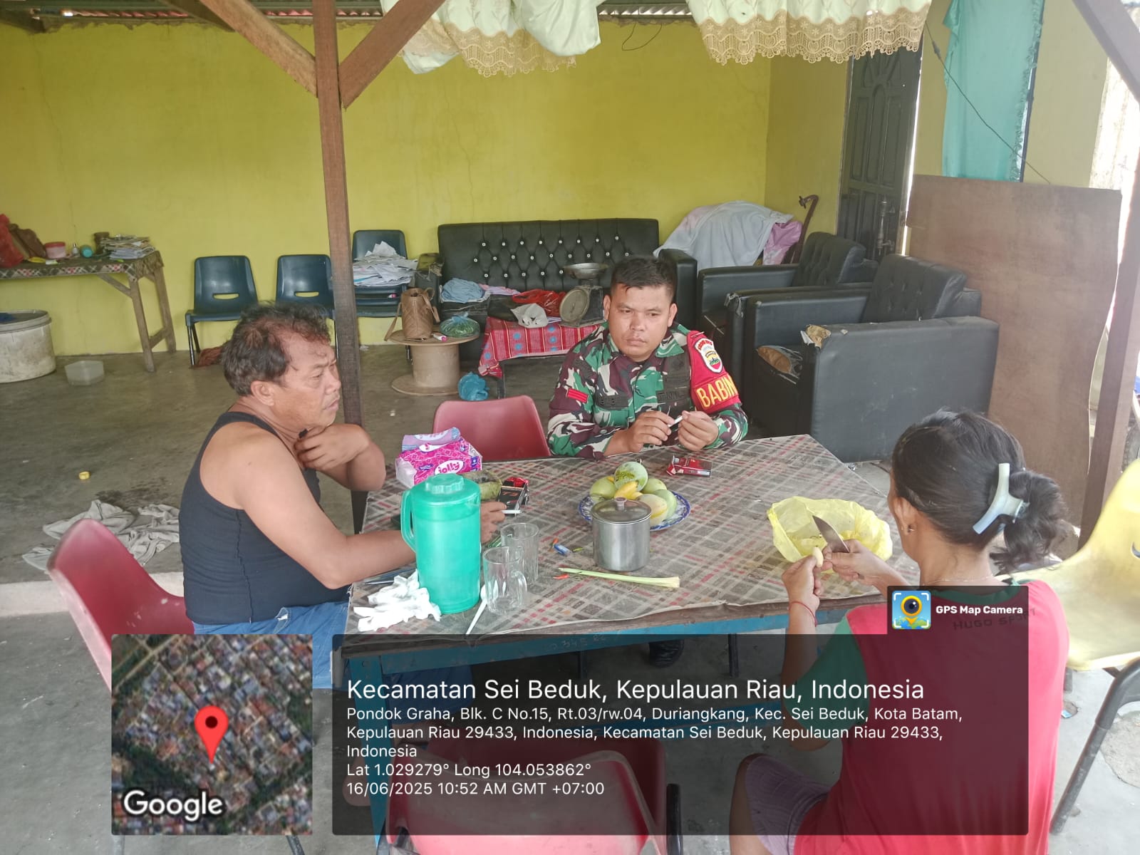 Kodim0316] Babinsa 16 Kelurahan Duriangkang Praka B. Nababan melaksanakan komsos dengan Bersama Warga bertempat di Perumahan Pancur Biru Lestari RW 005 Rt 04 Kel. Duriangkang Kec.Sei Beduk.Senin [16/06/2025].