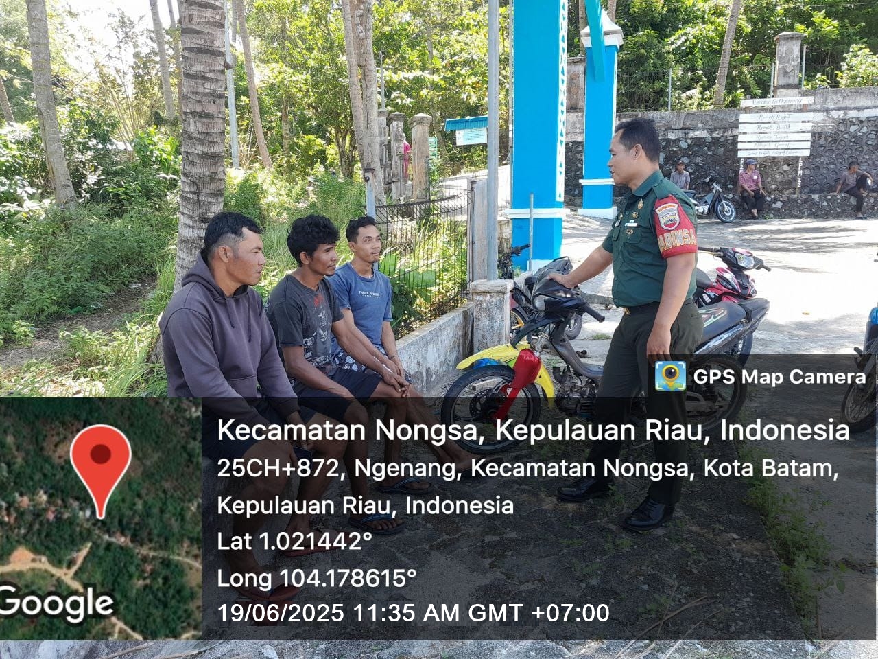 Kodim0316] Babinsa 08 Ngenang Sertu Alexsander Koramil 03/Nongsa melaksanakan Komsos dengan para tokoh pemuda bertempat di Rt 1 Rw 1 Pulau Ngenang Kel.Ngenang Kec Nongsa.Kamis [19/06.2025].
