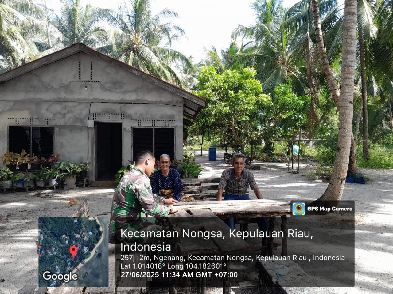 Kodim0316] Babinsa 08 Ngenang Sertu Alexsander Koramil 03/Nongsa melaksanakan Komsos bersama warga bertempat di rumah Bapak Zainal Rt 1 Rw 1 Kel.Ngenang Kec Nongsa.Jum’at [27/06/2025].
