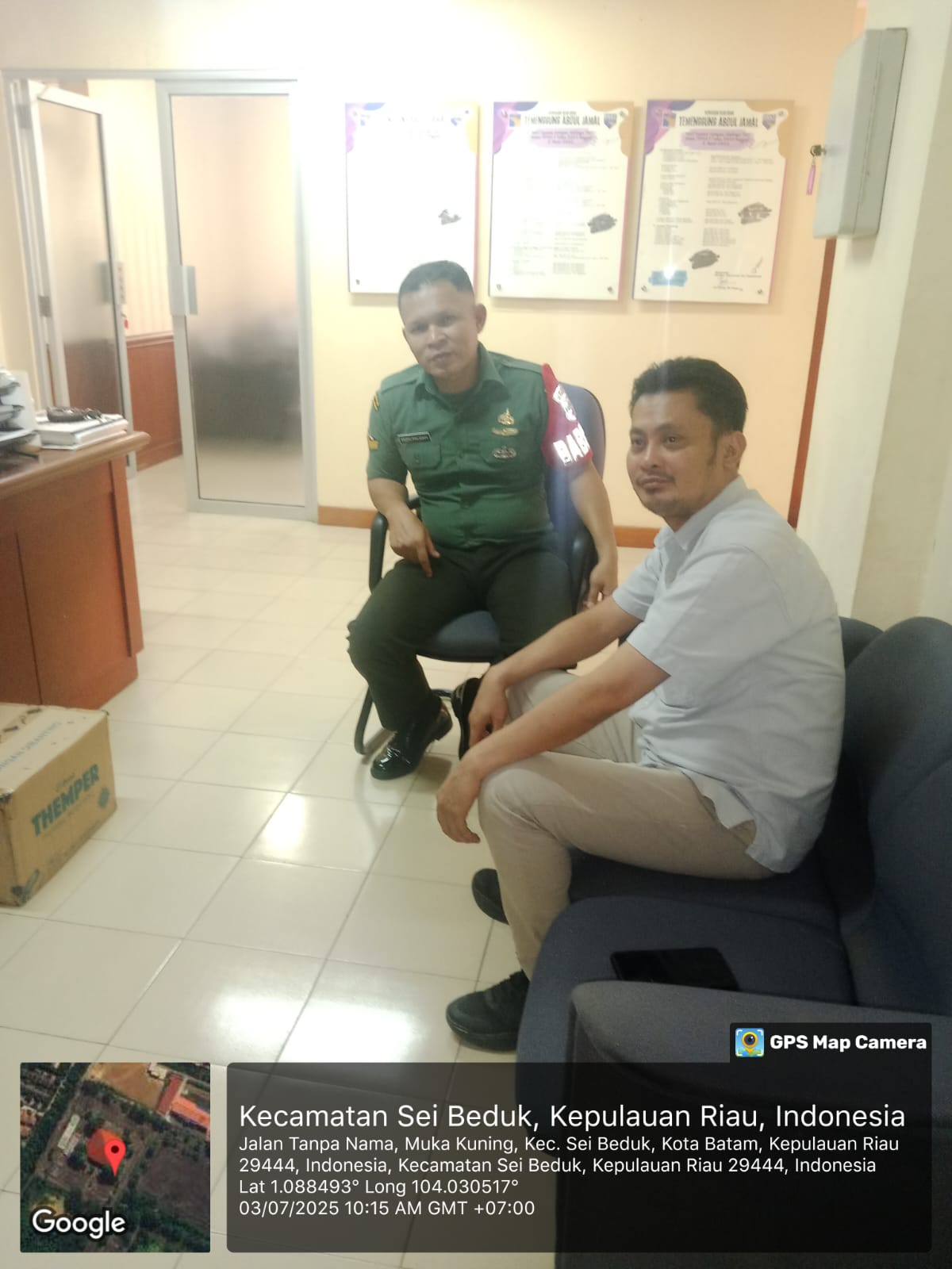 Kodim0316] Babinsa 15 Kel.Muka kuning Sertu Rizki ,Melaksanakan komsos di kantor pengelola hall Tumenggung kelurahan Muka kuning kec. Sungai beduk.Kamis [03/07/2025].