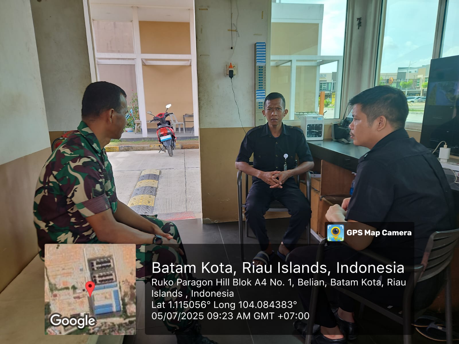KODIM0316] Babinsa 06 Kelurahan belian Koramil 03/Nongsa melaksanakan kegiatan Komsos bersama Petugas Keamanan yang bertempat di Perumahan Paragon Hill RW 30 Kelurahan Belian Kecamatan Batam Kota.Sabtu [05/2025].