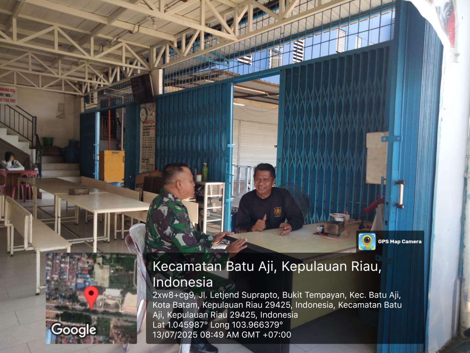 Kodim0316] Babinsa 14 bukit tempayan Koramil 02/Sekupang Sertu Mukhtar melaksanakan kegiatan komsos bersama anggota Security bertempat di lapangan Futsal kelurahan bukit tempayan Kec batu Aji.Minggu (13/07/2025].