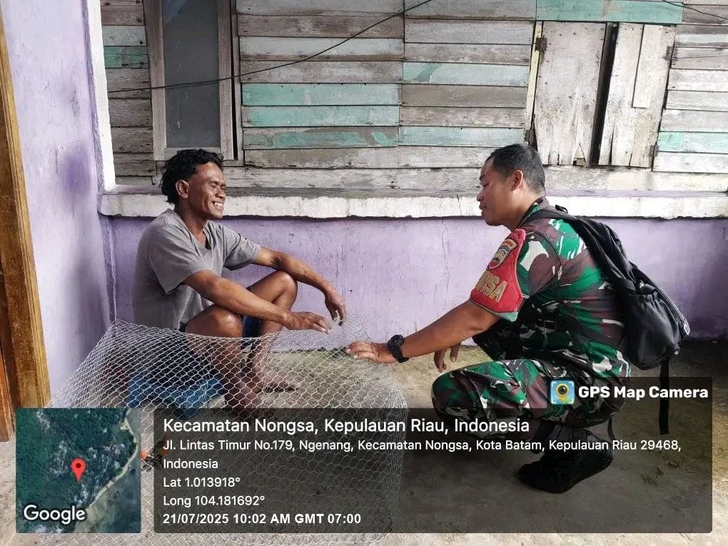 Kodim0316] Babinsa 08 Ngenang Sertu Alexsander Koramil 03/Nongsa melaksanakan komsos bersama dengan warga binaan bertempat di pelantar rumah Bpk Khaidir Rt 1 Rw 2 Pulau Kubung Kel.Ngenang Kec Nongsa.Senin [21/07/2025].