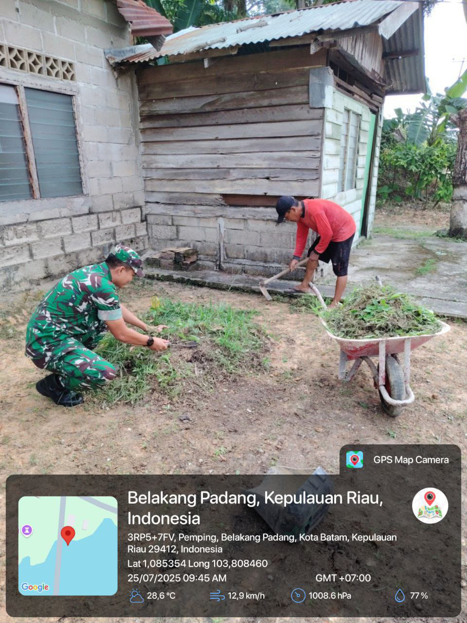 Kodim0316] Babinsa 03/Pemping Serka Eko Pranoto melaksanakan kegiatan komsos sekaligus membantu warga membersihkan pekarangan bertempat di Kelurahan Pemping, Kecamatan Belakang Padang.Kamis [25/07/2025].