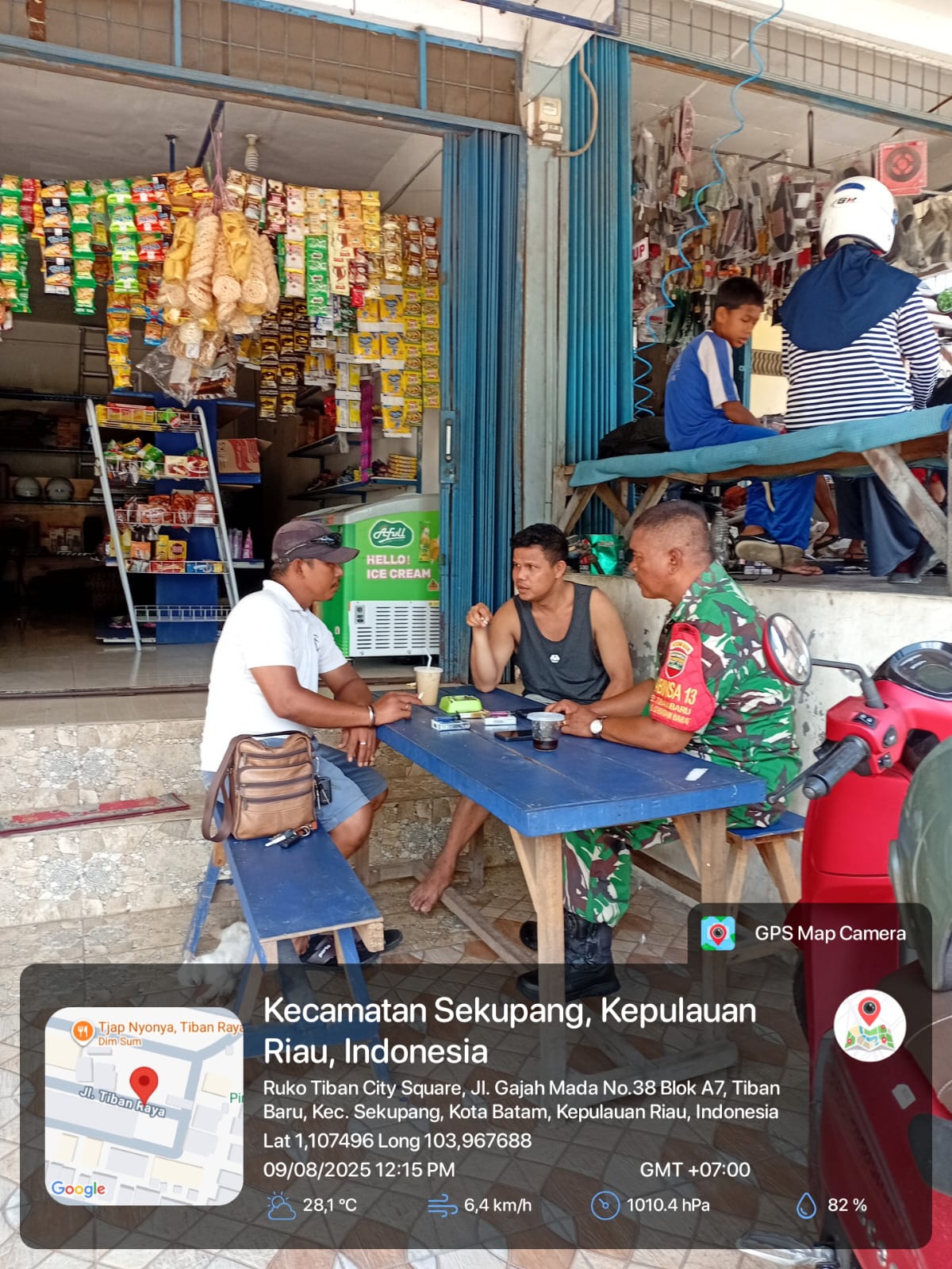 Kodim0316] Babinsa Kelurahan Tiban Baru Koramil 02/Sekupang, Serka T. Siburian, melaksanakan komunikasi sosial (Komsos) bersama warga binaan di Komplek Ruko Tiban Raya, Kelurahan Tiban Baru, Kecamatan Sekupang, pada Sabtu (9/8/2025) pukul 11.30 WIB.
