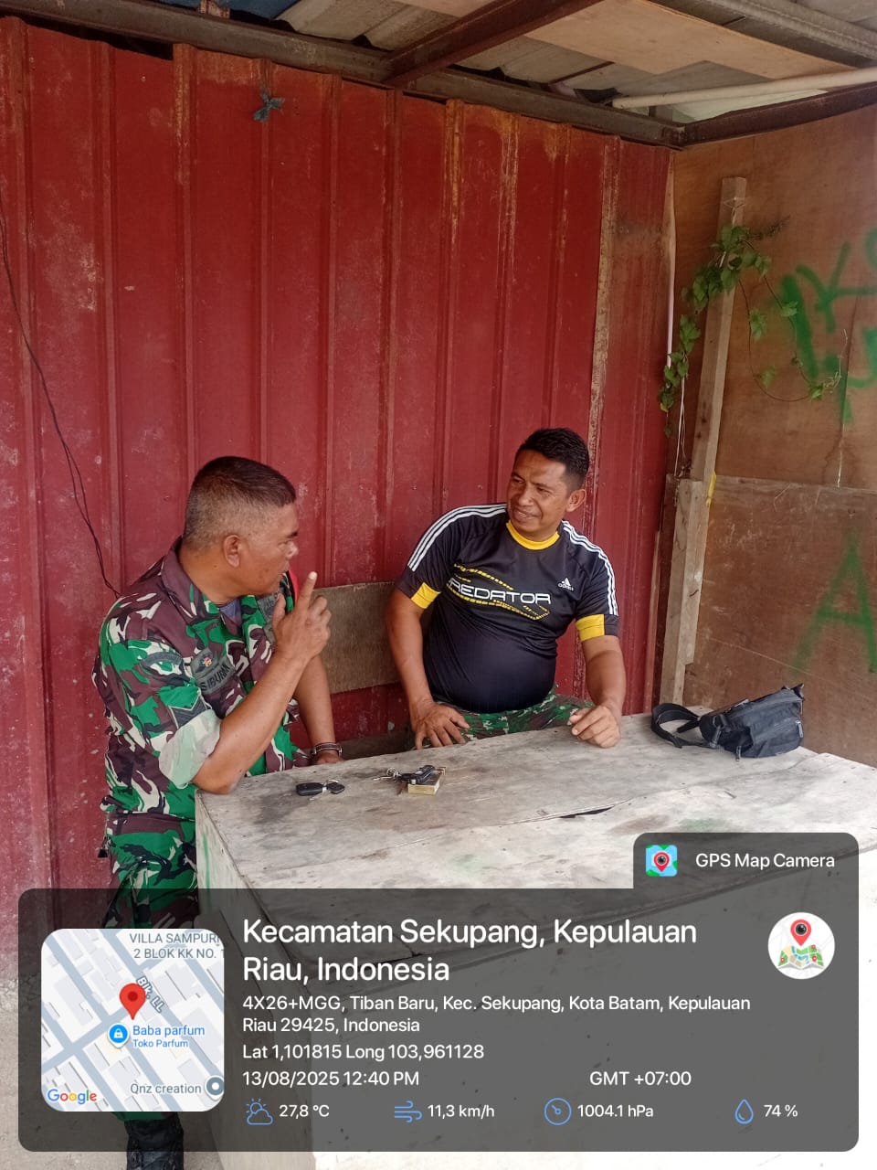 Kodim0316] Babinsa 13 Kelurahan Tiban Baru Koramil 02/Sekupang, Serka T. Siburian, melaksanakan komunikasi sosial (Komsos) bersama warga binaan di Kelurahan Tiban Baru, Kecamatan Sekupang, Rabu (13/8/2025) pukul 12.30 WIB.