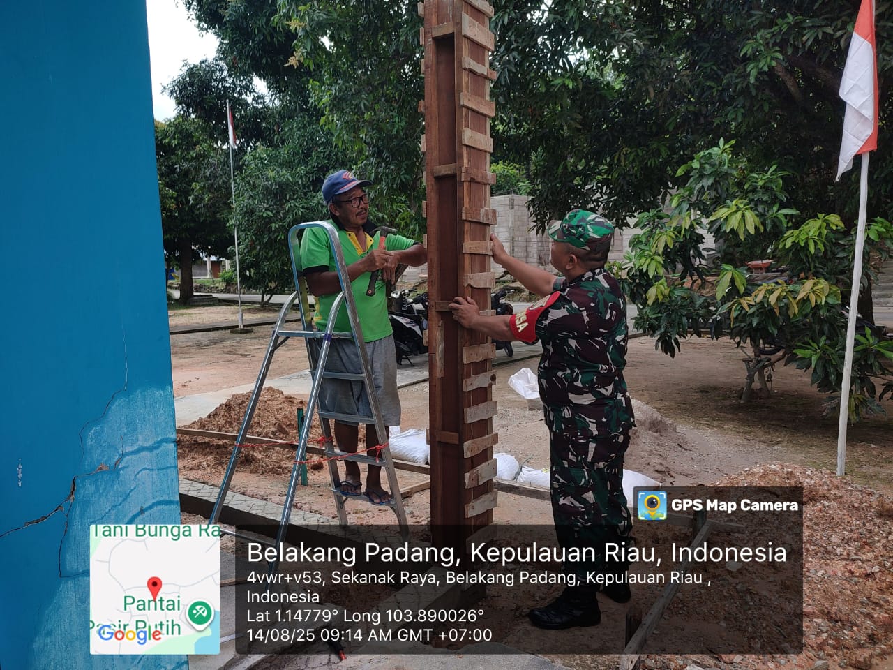 Membantu warga yang sedang memperbaiki tiang rumah, serta mengimbau agar pekerjaan dilakukan dengan baik, hati-hati, dan menjaga kerapian lingkungan dari sisa-sisa material bangunan.