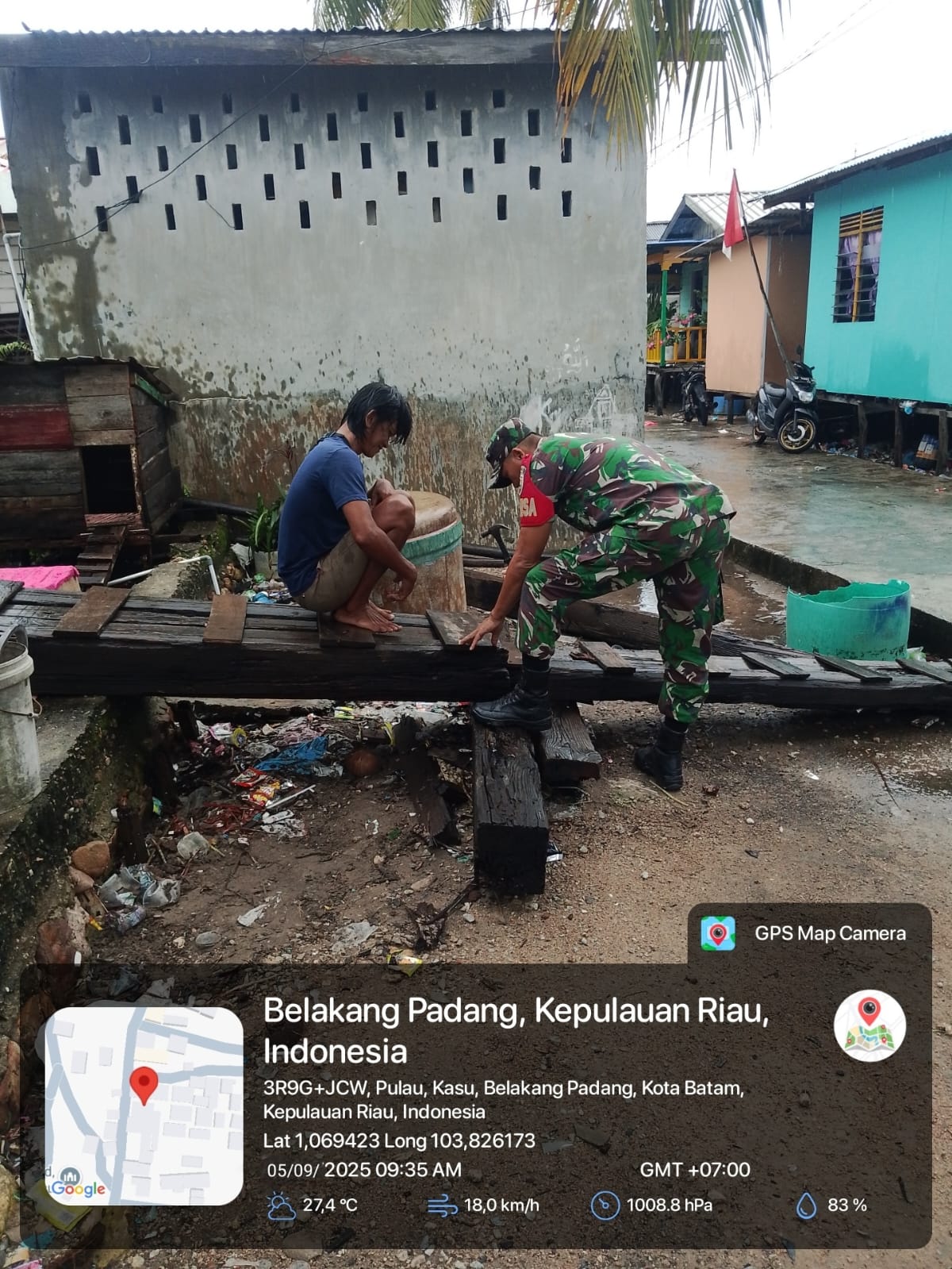 Kehadiran Babinsa tidak hanya untuk menjalin komunikasi, tetapi juga ikut membantu warga yang sedang membangun jembatan penghubung menuju salah satu rumah warga. Turut hadir dalam kegiatan tersebut, tokoh masyarakat setempat, Bapak Firdaus.