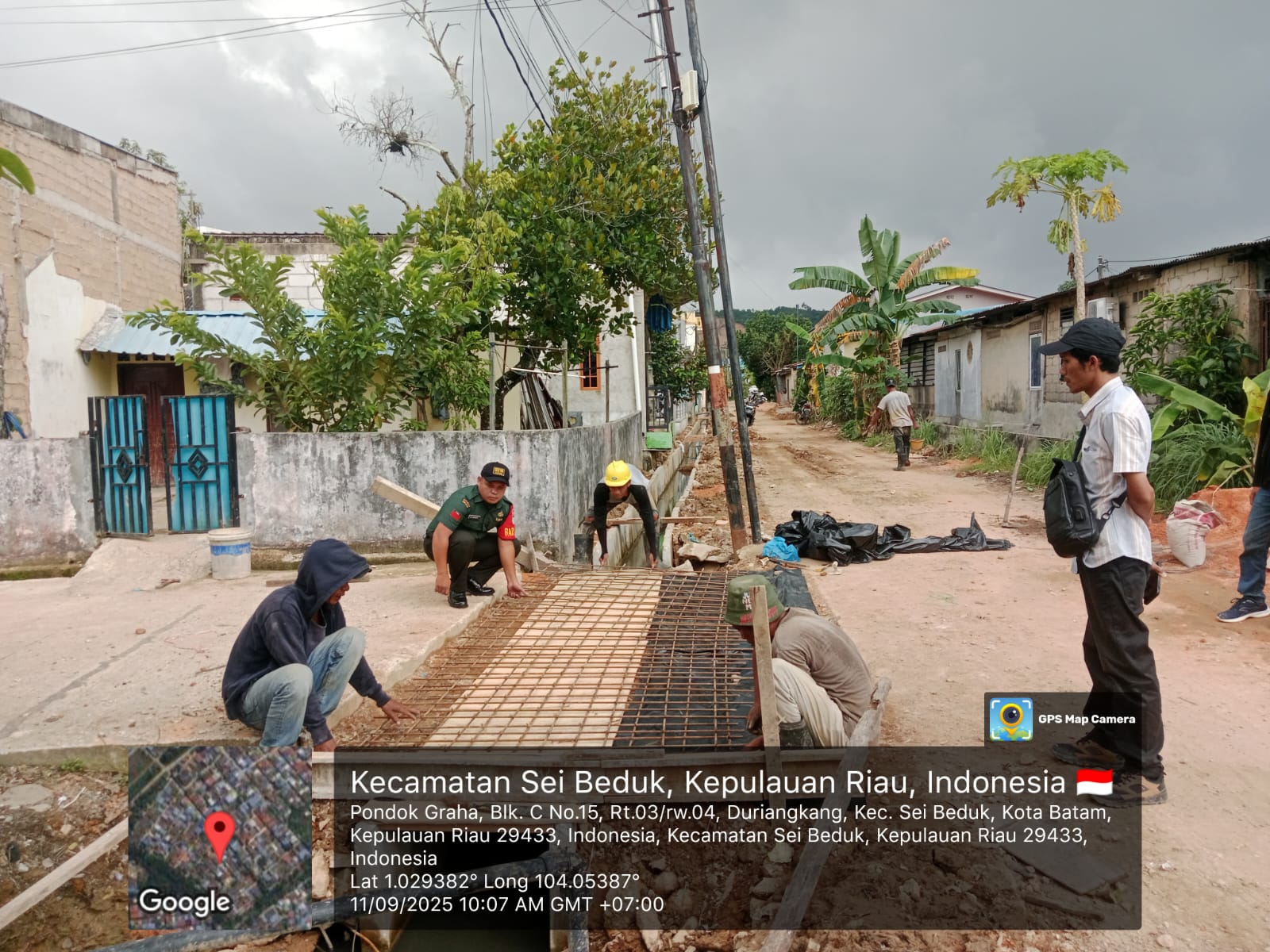 Kodim0316] Babinsa 16 Kelurahan Duriangkang, Koramil 01/Lubuk Baja, Praka Benaven Nababan, melaksanakan kegiatan komunikasi sosial (Komsos) bersama para pekerja bangunan di Komplek Perumahan Pancur Biru Lestari, RW 05/RT 04, Kelurahan Duriangkang, Kecamatan Sei Beduk, Kamis (11/9/2025).