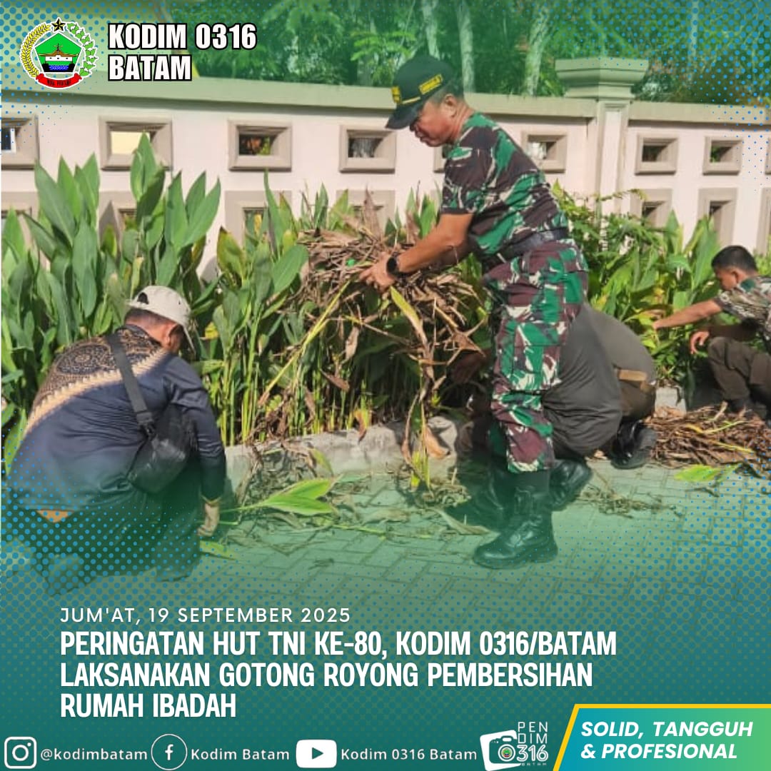 Kodim0316] Memperingati Hari Ulang Tahun (HUT) ke-80 Tentara Nasional Indonesia (TNI), Kodim 0316/Batam menggelar aksi sosial berupa gotong royong pembersihan rumah ibadah. Kegiatan kali ini difokuskan di Masjid Nurul Ikhwan, Perumahan Griya, Kelurahan Belian, Kecamatan Batam Kota, pada Jumat (19/9/2025).