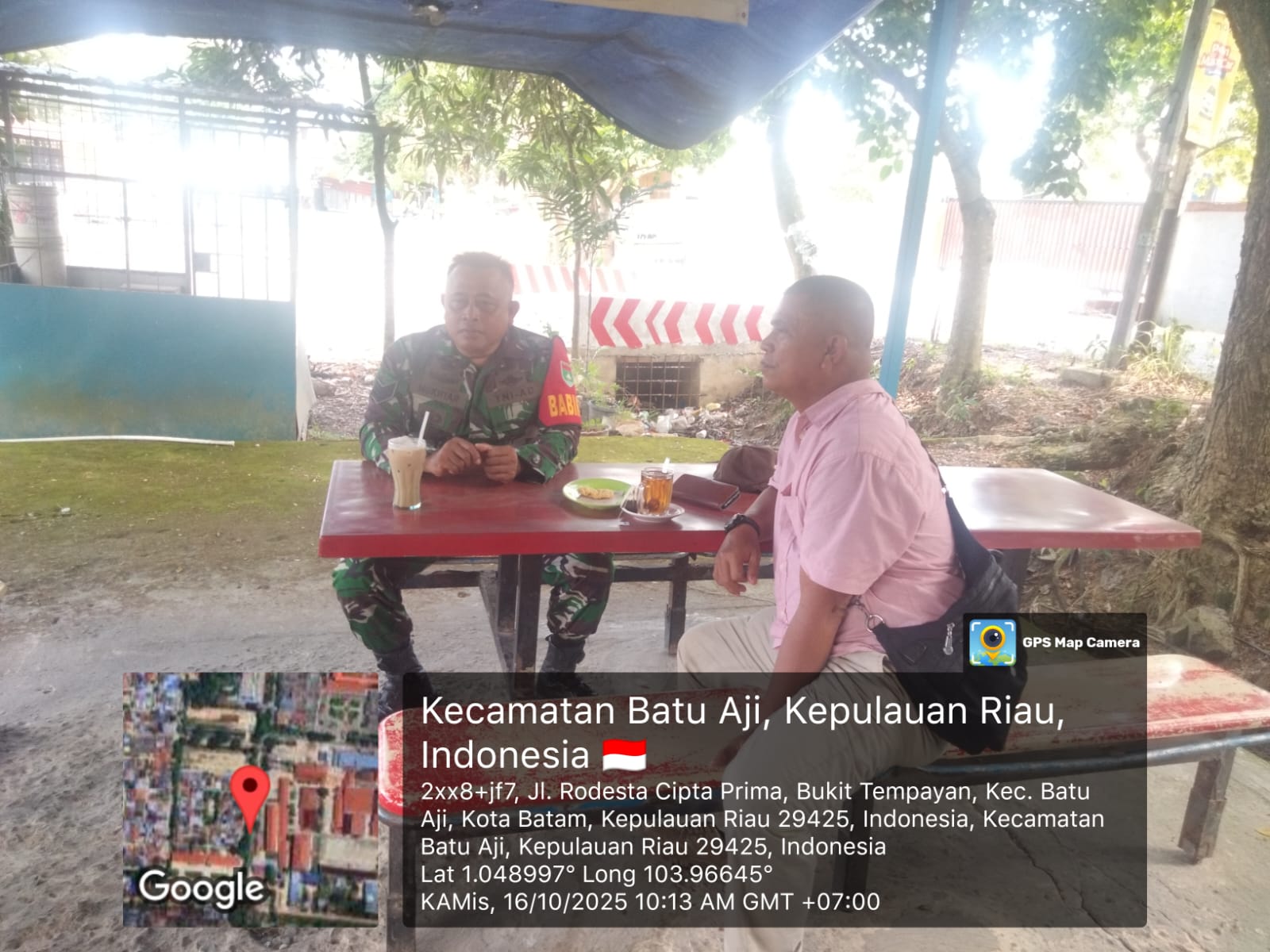 Kodim0316] Dalam upaya memperkuat sinergi antara aparat kewilayahan dan pemerintah kelurahan, Babinsa 14 Bukit Tempayan, Koramil 02/Sekupang, Kodim 0316/Batam, Serka Mukhtar, melaksanakan kegiatan Komunikasi Sosial (Komsos) bersama Kasi Trantib Kelurahan Bukit Tempayan, Bapak H. Sinaga, Kamis (16/10/2025).