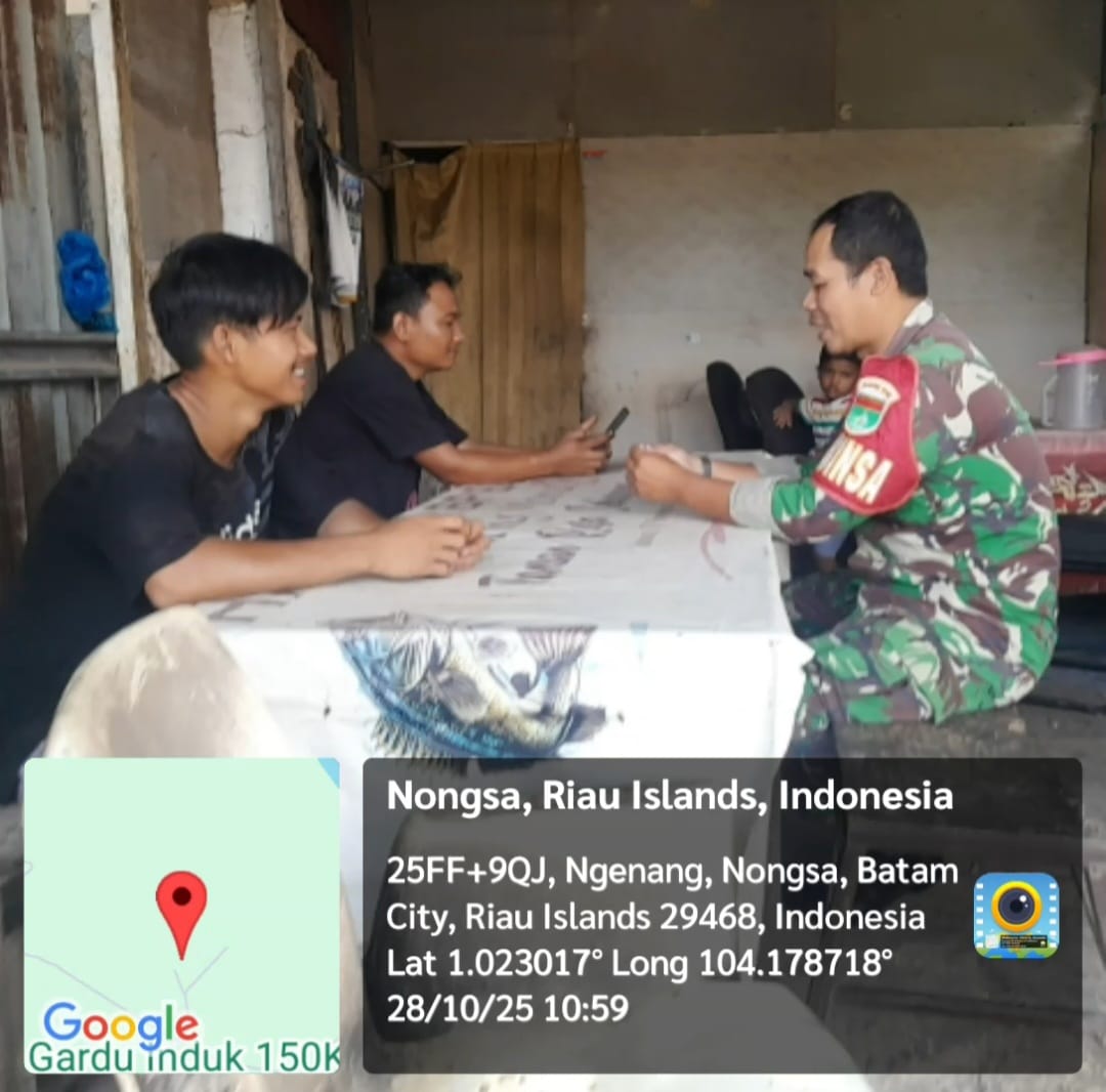 Kodim0316] Dalam rangka mempererat kemanunggalan TNI dengan rakyat dan menjaga stabilitas keamanan di wilayah binaan, Babinsa Kelurahan Ngenang Koramil 03/Nongsa Kodim 0316/Batam, Sertu Alexsander, melaksanakan kegiatan komunikasi sosial (Komsos) bersama warga di RT 1 RW 3 Kelurahan Ngenang, Kecamatan Nongsa, Selasa (28/10/2025).
