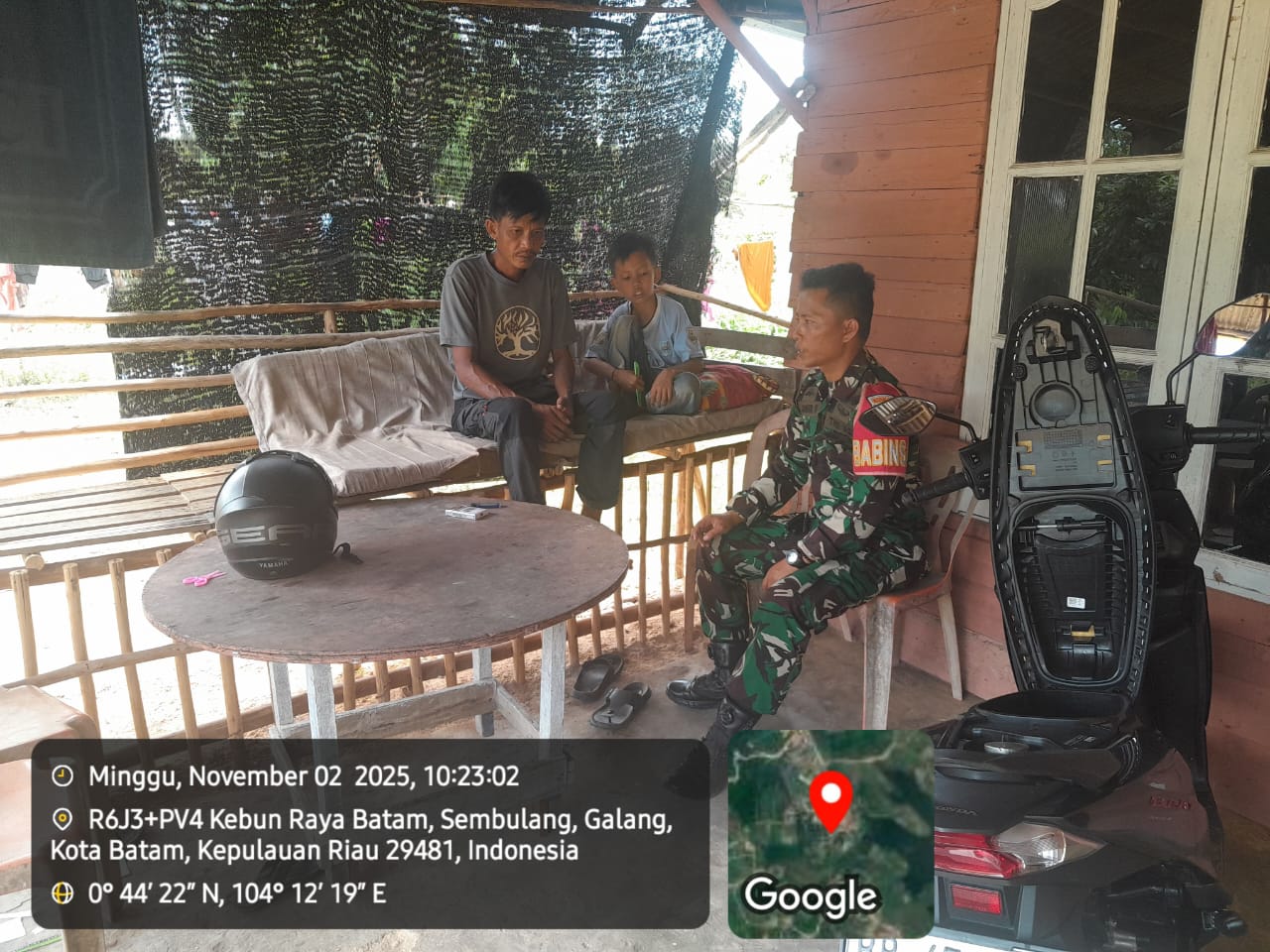 Kodim0316] Dalam upaya mempererat hubungan dengan masyarakat serta menjaga stabilitas keamanan di wilayah, Babinsa Kelurahan Sembulang, Koramil 04/Galang Kodim 0316/Batam, Serda J. Simanjuntak melaksanakan kegiatan Komunikasi Sosial (Komsos) bersama warga binaan di Kelurahan Sembulang, Kecamatan Galang, pada Minggu (2/11/2025) pukul 10.00 WIB.