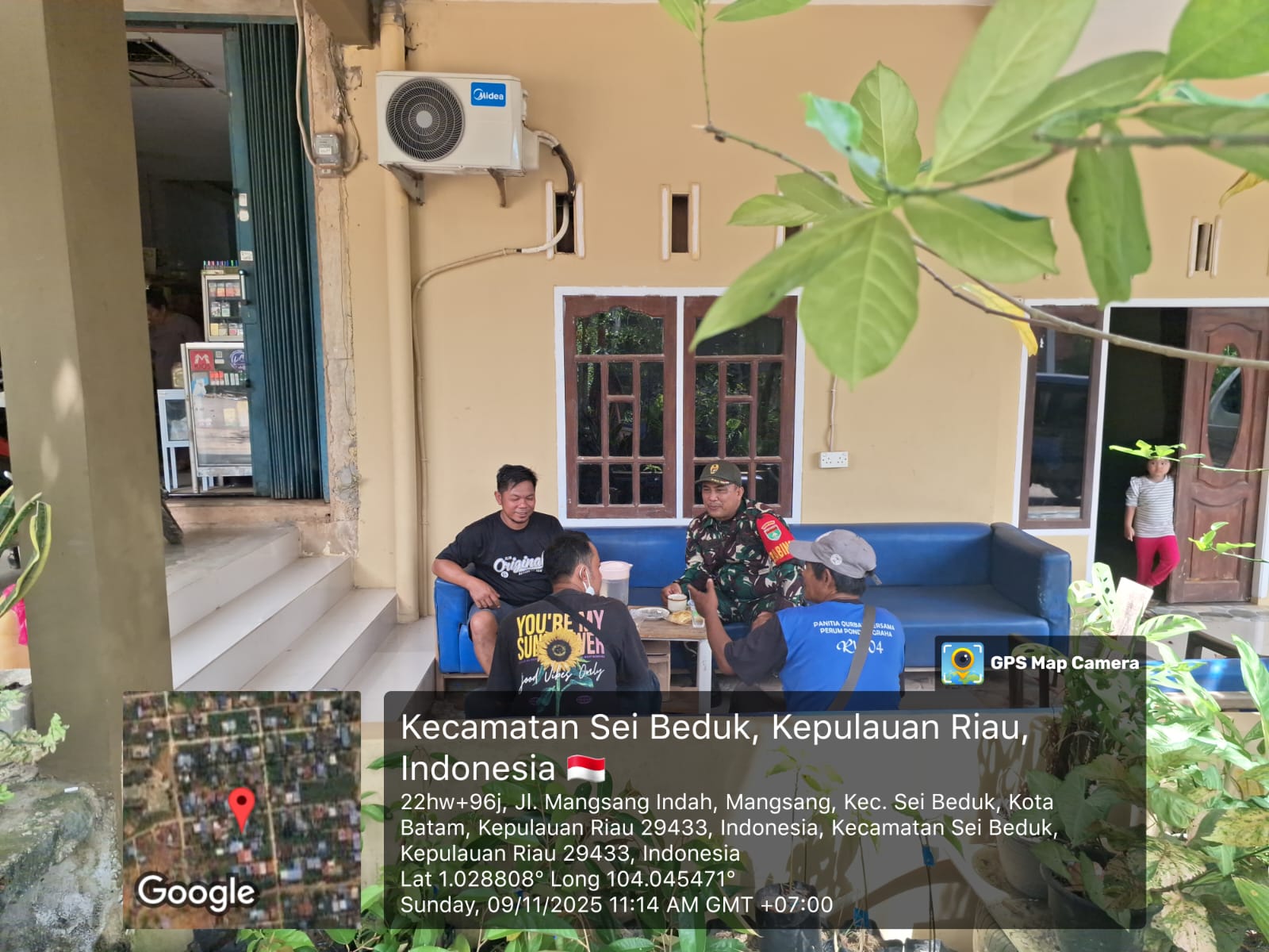 Kodim0316] Dalam upaya mempererat hubungan dengan masyarakat serta menjaga kondusifitas wilayah, Babinsa Kelurahan Mangsang Koramil 01/Lubuk Baja Kodim 0316/Batam, Serka Azuar Siregar, melaksanakan kegiatan komunikasi sosial (komsos) bersama warga binaan di RT 02 RW 24 Kelurahan Mangsang, Kecamatan Sei Beduk, Minggu (9/11/2025).