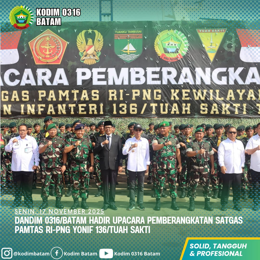 Kodim0316]  Komandan Kodim 0316/Batam, Kolonel Arh Yang Eka Putra, S.Sos., menghadiri upacara pemberangkatan Satuan Tugas Pengamanan Perbatasan (Satgas Pamtas) RI–Papua Nugini (PNG) Yonif 136/Tuah Sakti yang digelar di Pelabuhan Batu Ampar, Kota Batam, Senin (17/11/2025). Upacara berjalan khidmat, menandai dimulainya penugasan selama satu tahun bagi para prajurit yang akan menjaga kedaulatan negara di perbatasan timur Indonesia.