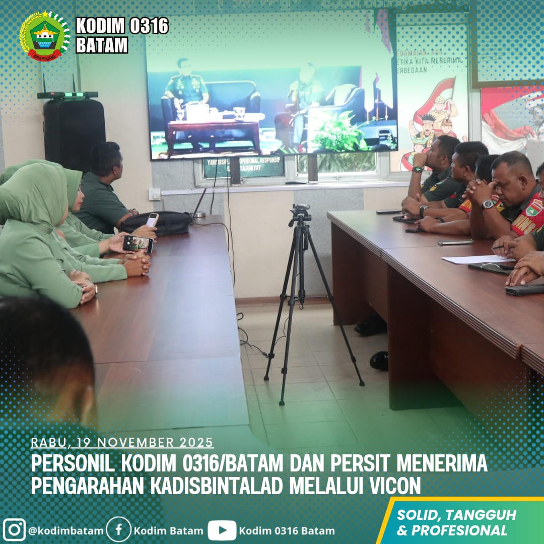 Kodim0316] Personel Kodim 0316/Batam bersama Persit Kartika Chandra Kirana (KCK) Cabang LXIX Dim 0316 Koorcab Rem 033 PD XIX/Tuanku Tambusai mengikuti pengarahan Kepala Dinas Pembinaan Mental Angkatan Darat (Kadisbintalad) melalui aplikasi konferensi video, Rabu (19/11/2025). Kegiatan tersebut digelar serentak sebagai bagian dari program pembinaan mental terpusat yang dilaksanakan jajaran TNI AD.