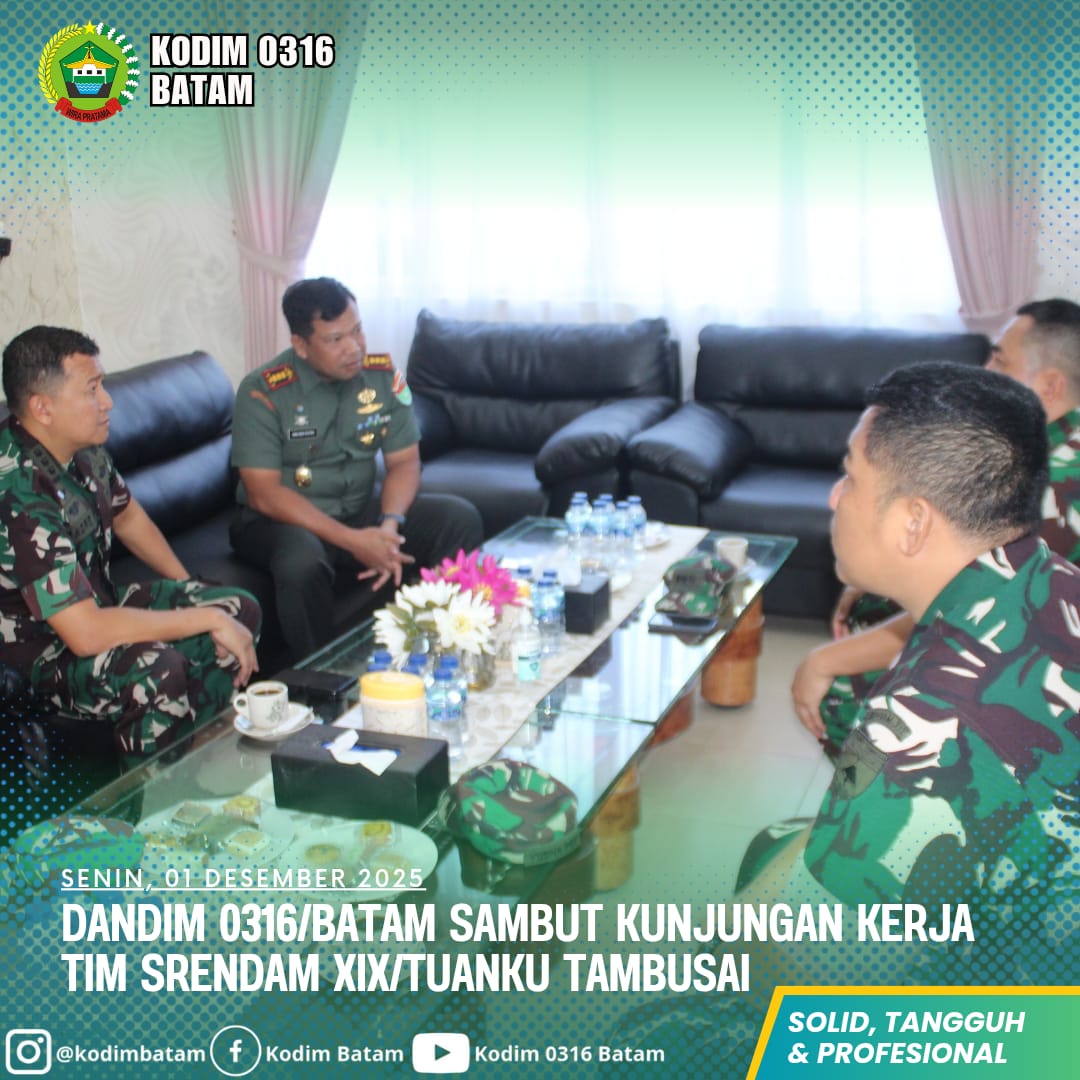 Kodim0316] – Komandan Kodim 0316/Batam Kolonel Arh Yan Eka Putra, S.Sos., menyambut kedatangan Tim Staf Perencanaan dan Administrasi (Srendam) Kodam XIX/Tuanku Tambusai dalam kunjungan kerja ke Markas Kodim 0316/Batam, Senin (1/12/2025). Kegiatan dipimpin langsung Ketua Tim, Kolonel Arh Andre Wira.