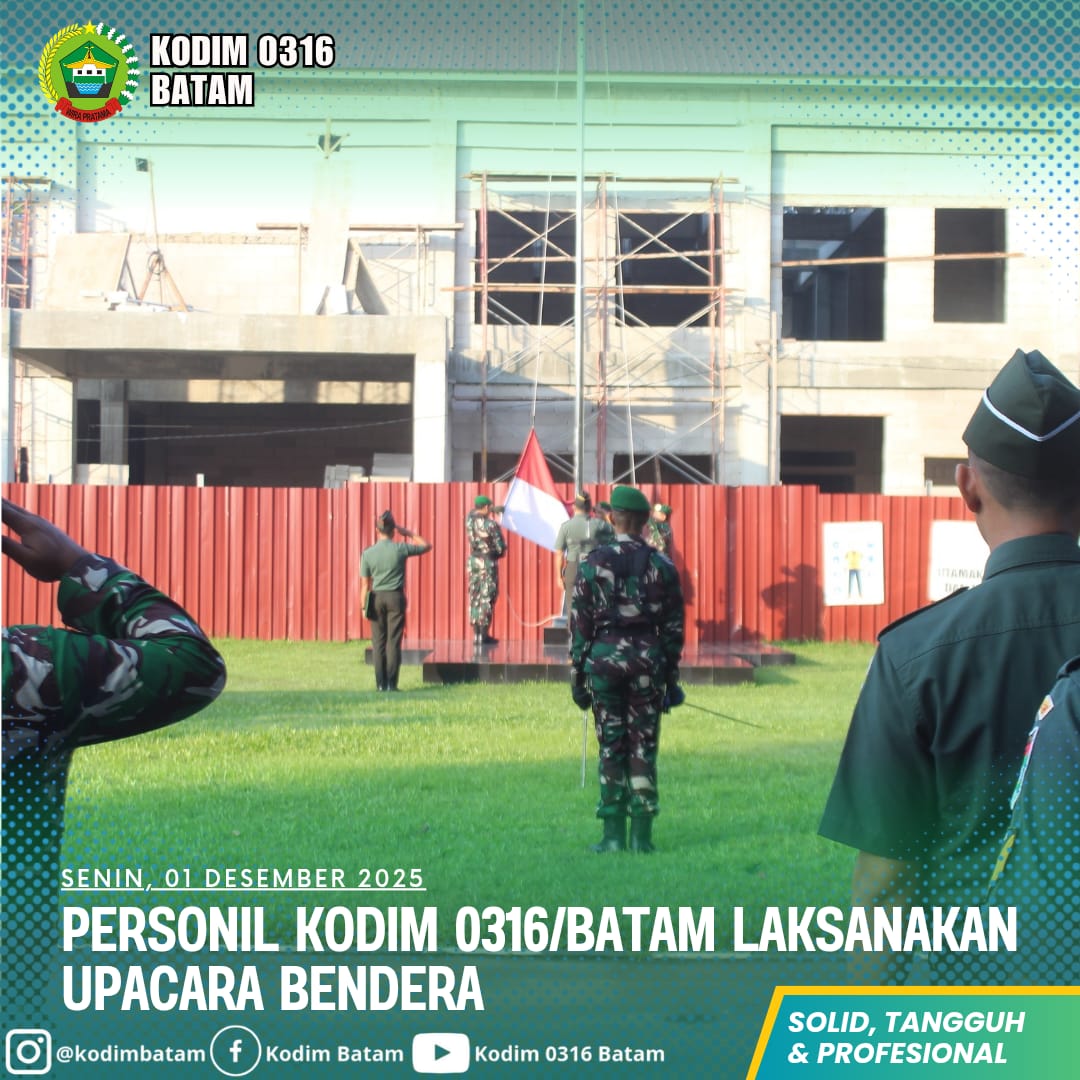 Kodim0316]  Personel Komando Distrik Militer (Kodim) 0316/Batam menggelar upacara bendera dengan khidmat di Lapangan Makodim, Senin (1/12/2025) pagi. Kegiatan rutin ini tidak hanya menjadi bentuk penghormatan terhadap lambang negara, tetapi juga momentum untuk memperkuat kedisiplinan, loyalitas, serta soliditas prajurit di lingkungan Kodim 0316/Batam.