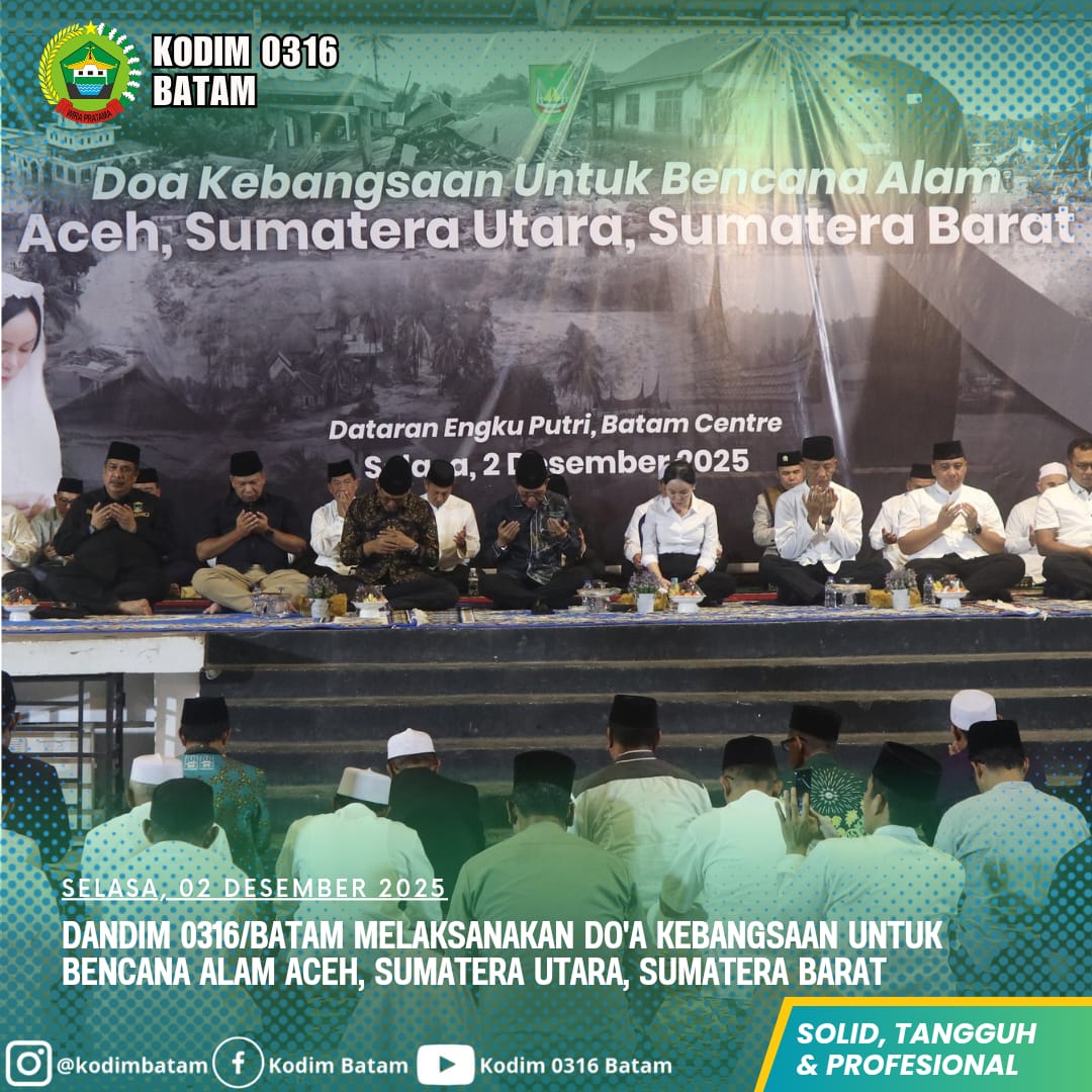 Kodim0316] Komandan Distrik Militer (Dandim) 0316/Batam Kolonel Arh Yan Eka Putra, S.Sos., menghadiri pelaksanaan Doa Kebangsaan yang digelar Pemerintah Kota Batam sebagai bentuk solidaritas terhadap masyarakat yang terdampak bencana alam di Aceh, Sumatera Utara, dan Sumatera Barat. Kegiatan berlangsung khidmat di Dataran Engku Putri, Batam Centre, Selasa (02/12/2025), dan dipimpin langsung oleh Wali Kota Batam H. Amsakar Ahmad.
