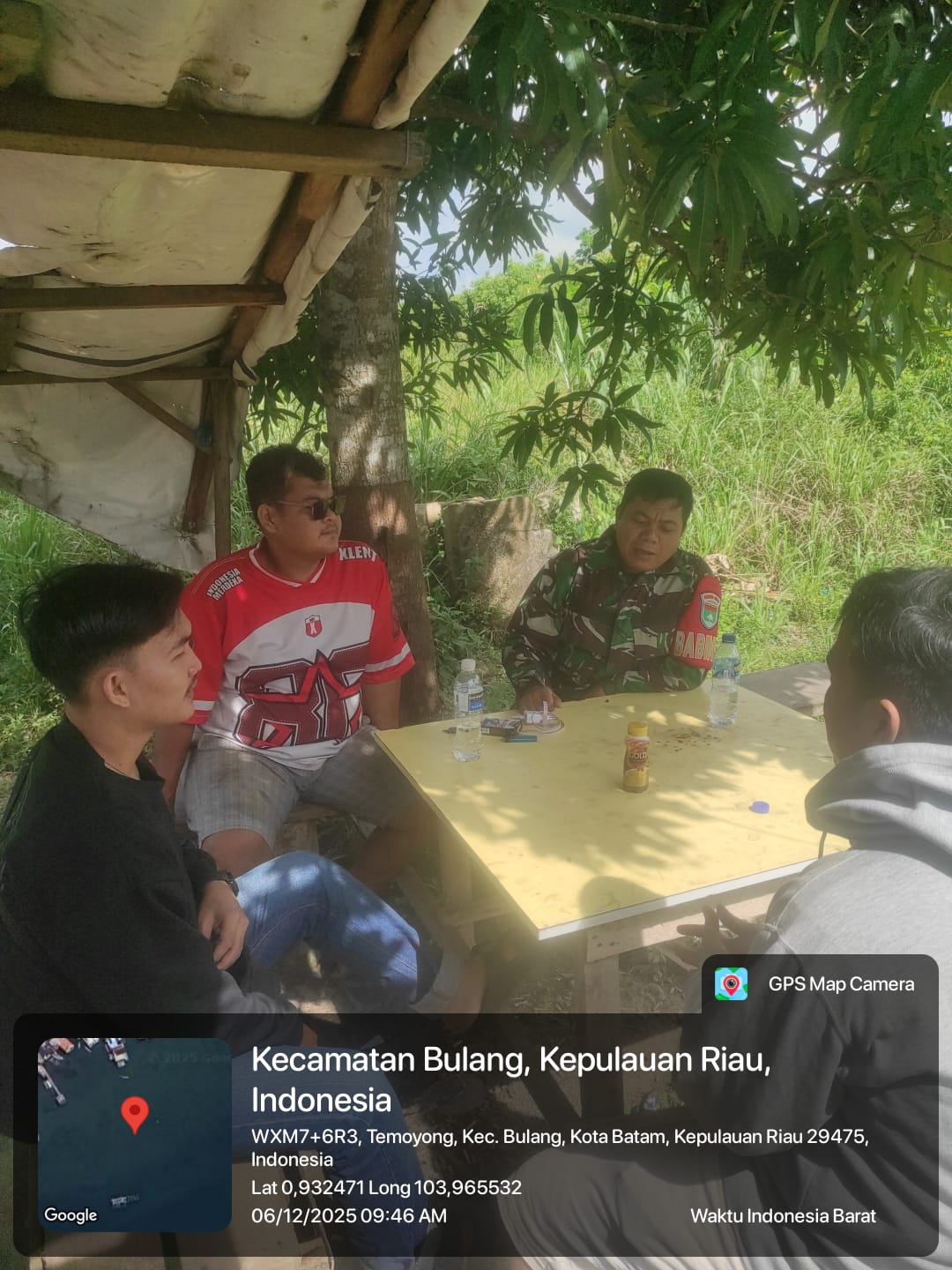 Kodim0316] Bintara Pembina Desa (Babinsa) Koramil 02/Sekupang terus meningkatkan kegiatan komunikasi sosial (komsos) dalam rangka menjaga stabilitas keamanan wilayah. Pada Sabtu (6/12/2025) pukul 09.30 WIB, Babinsa 22 Tumoyong Koramil 02/Sekupang, Serda J. Manalu, melaksanakan komsos bersama warga di Kelurahan Tumoyong, Kecamatan Bulang, Kota Batam.