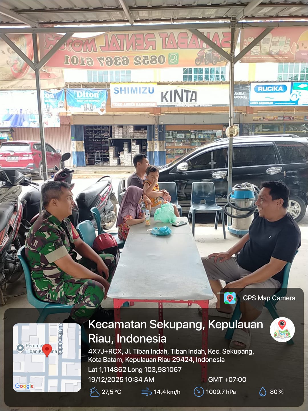 Kodim0316]  Babinsa Kelurahan Tiban Indah Koramil 02/Sekupang, Sertu M. Fitriadi, melaksanakan kegiatan komunikasi sosial (Komsos) bersama warga binaan di Kelurahan Tiban Indah, Kecamatan Sekupang, Kota Batam, Jumat (19/12/2025).