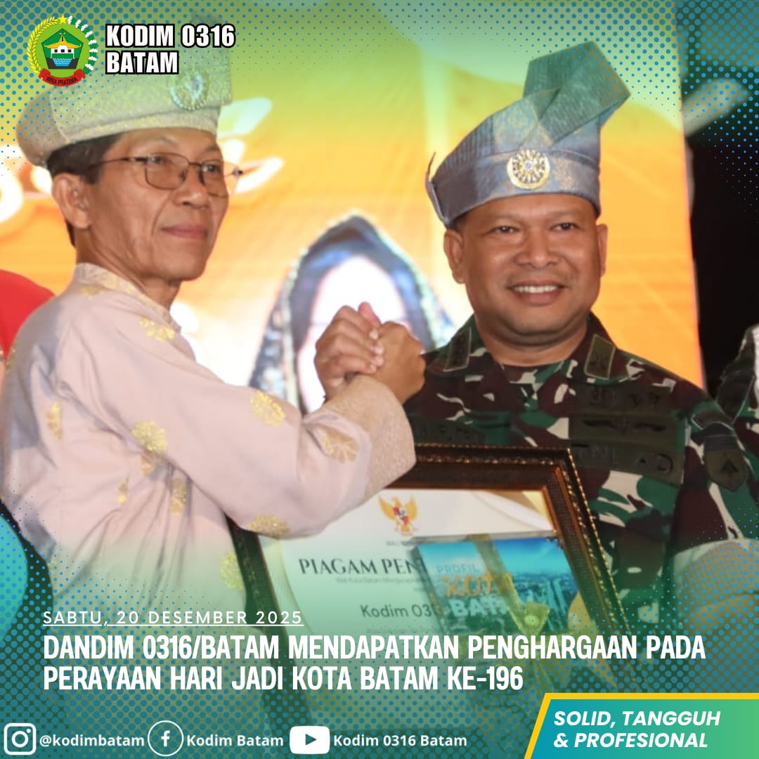 Kodim0316]  Komandan Distrik Militer (Dandim) 0316/Batam Kolonel Arh Yan Eka Putra, S.Sos, menerima penghargaan dari Pemerintah Kota Batam pada perayaan Hari Jadi Kota Batam ke-196. Penghargaan tersebut diserahkan langsung oleh Wali Kota Batam, Amsakar Ahmad, dalam acara resmi yang digelar di Kota Batam, Sabtu (20/12/2025).
