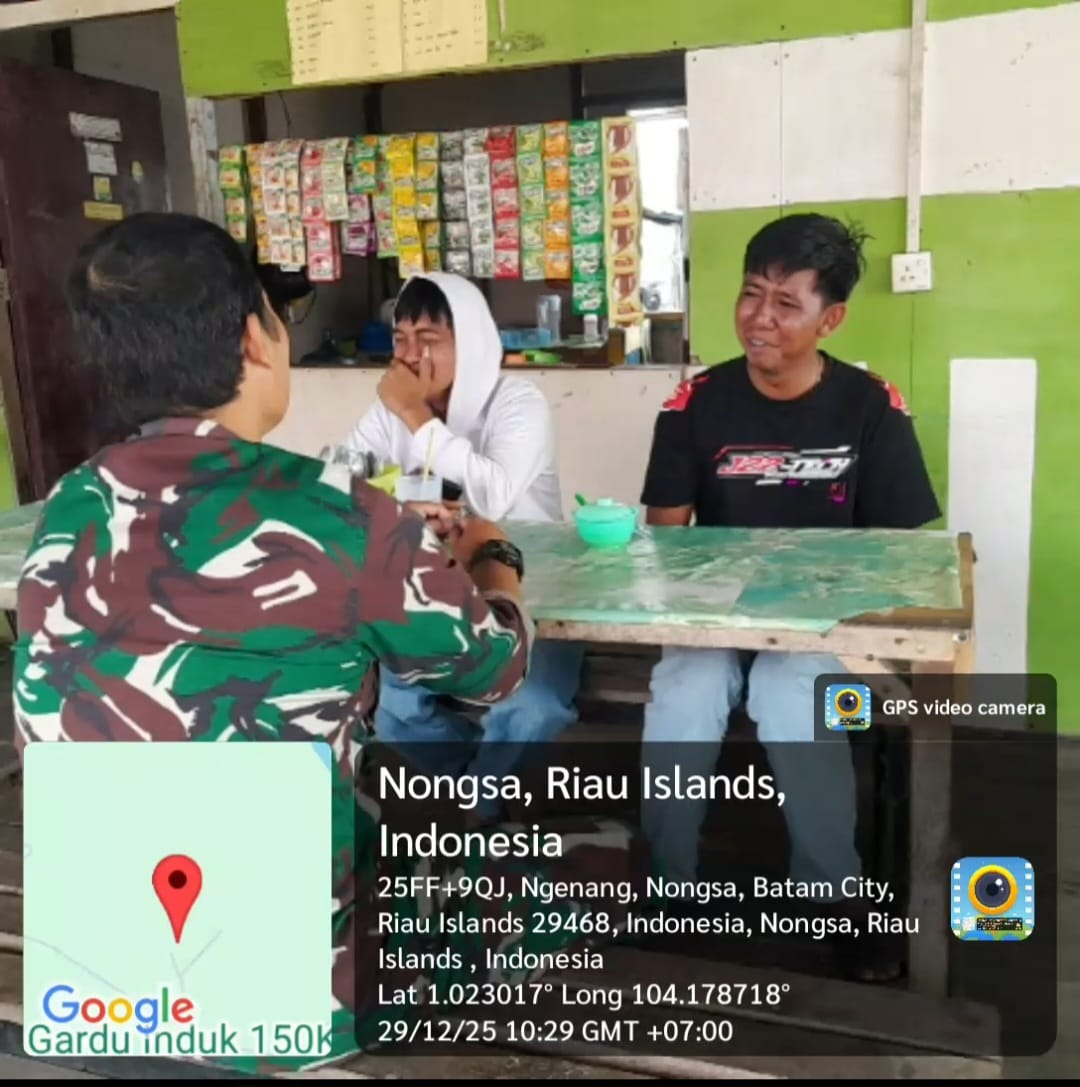 Kodim0316] Babinsa Kelurahan Ngenang, Koramil 03/Nongsa, terus mengintensifkan kegiatan komunikasi sosial (komsos) sebagai bagian dari upaya pembinaan teritorial dan penguatan hubungan antara TNI dengan masyarakat di wilayah binaan. Salah satu kegiatan tersebut dilaksanakan pada Senin (29/12/2025) di Pulau Ngenang, Kecamatan Nongsa, Kota Batam.