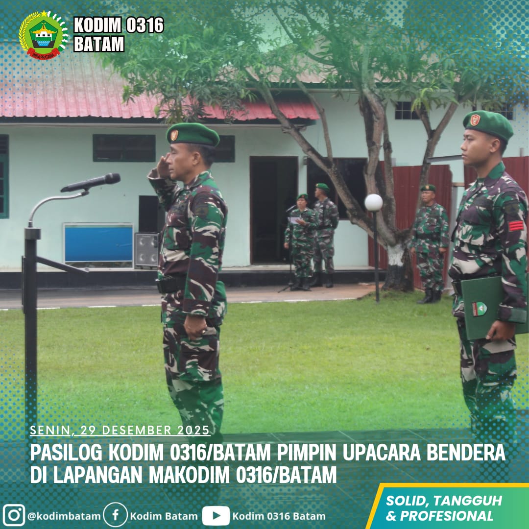 Kodim0316] Perwira Seksi Logistik (Pasilog) Kodim 0316/Batam, Mayor Cpl Hendra Titus Sembiring Meliala, memimpin pelaksanaan upacara bendera yang digelar di Lapangan Markas Komando Distrik Militer (Makodim) 0316/Batam, Senin (29/12/2025). Upacara tersebut diikuti oleh seluruh prajurit Kodim 0316/Batam dan berlangsung dengan tertib serta khidmat.