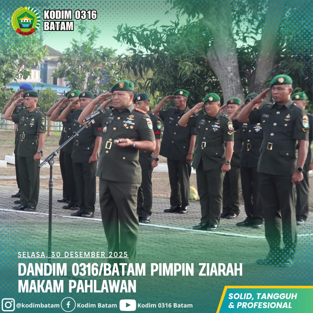Kodim0316] Komandan Distrik Militer (Dandim) 0316/Batam, Kolonel Arh Yan Eka Putra, S.Sos., memimpin kegiatan ziarah makam pahlawan dalam rangka memperingati Hari Ulang Tahun (HUT) ke-20 Komando Resor Militer (Korem) 033/Wira Pratama. Kegiatan tersebut berlangsung di Taman Makam Pahlawan (TMP) Bulang Gebang, Kecamatan Batu Aji, Kota Batam, Selasa (30/12/2025).