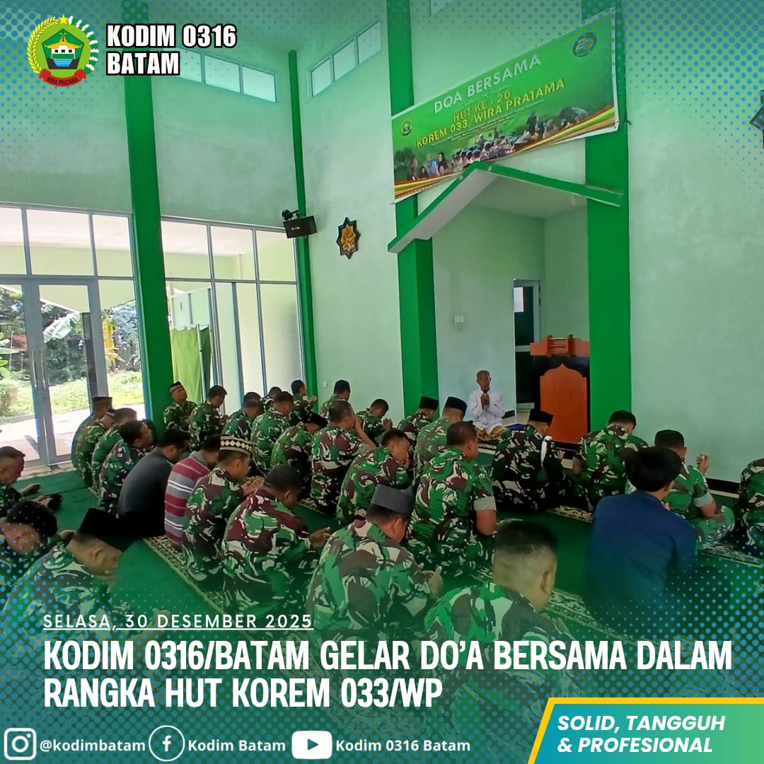 Kodim0316]  Komando Distrik Militer (Kodim) 0316/Batam menggelar doa bersama dalam rangka memperingati Hari Ulang Tahun (HUT) Korem 033/Wira Pratama (WP). Kegiatan ini dilaksanakan secara khidmat di Masjid Al-Firman serta Aula Makodim 0316/Batam, Selasa (30/12/2025).