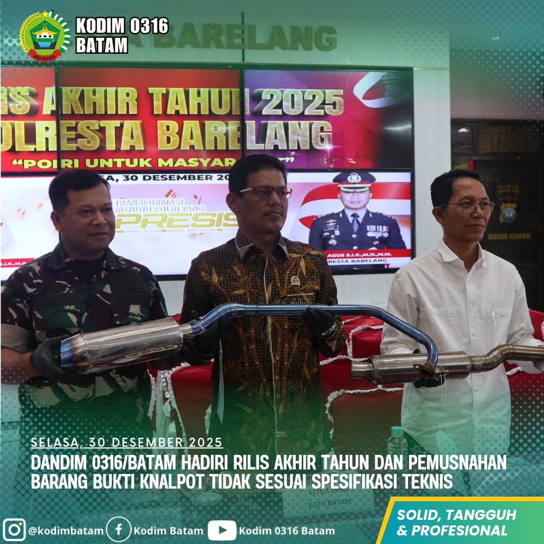 Kodim0316] Komandan Distrik Militer (Dandim) 0316/Batam Kolonel Arh Yan Eka Putra, S.Sos., menghadiri kegiatan rilis akhir tahun Polresta Barelang yang dirangkaikan dengan pemusnahan barang bukti knalpot kendaraan bermotor yang tidak sesuai dengan spesifikasi teknis. Kegiatan tersebut berlangsung di Markas Polresta Barelang, Kota Batam, Selasa (30/12/2025).