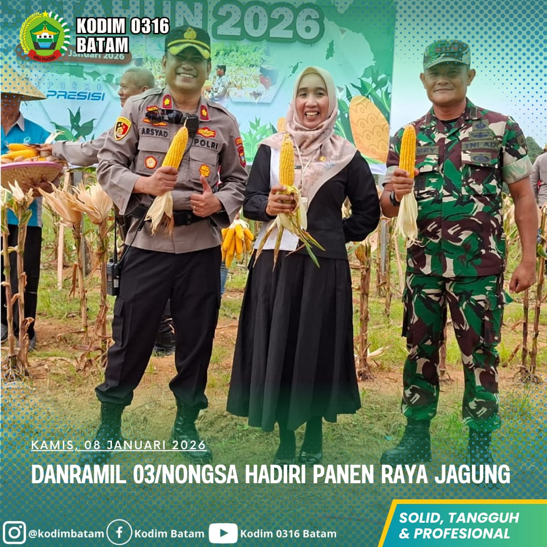 Kodim0316]  Komitmen TNI Angkatan Darat dalam mendukung program strategis nasional di bidang ketahanan pangan terus diwujudkan melalui berbagai kegiatan di wilayah. Salah satunya terlihat dalam kegiatan Panen Raya Jagung Serentak yang digelar di Kelurahan Sambau, Kecamatan Nongsa, Kota Batam, Kamis (8/1/2026).