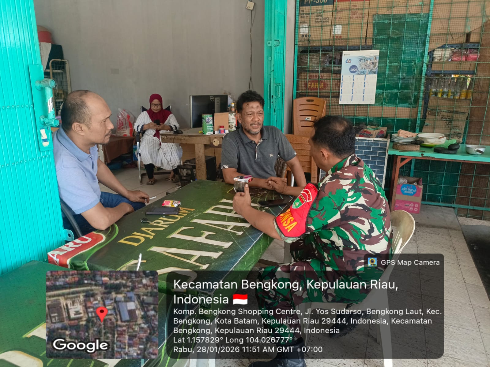 Kodim0316] Babinsa 10 Kelurahan Bengkong Laut Koramil 01/Lubuk Baja, Serma Epi Johar, melaksanakan kegiatan komunikasi sosial (komsos) bersama warga binaan di salah satu warung warga di Kelurahan Bengkong Laut, Kecamatan Bengkong, Kota Batam, Rabu (28/1/2026).
