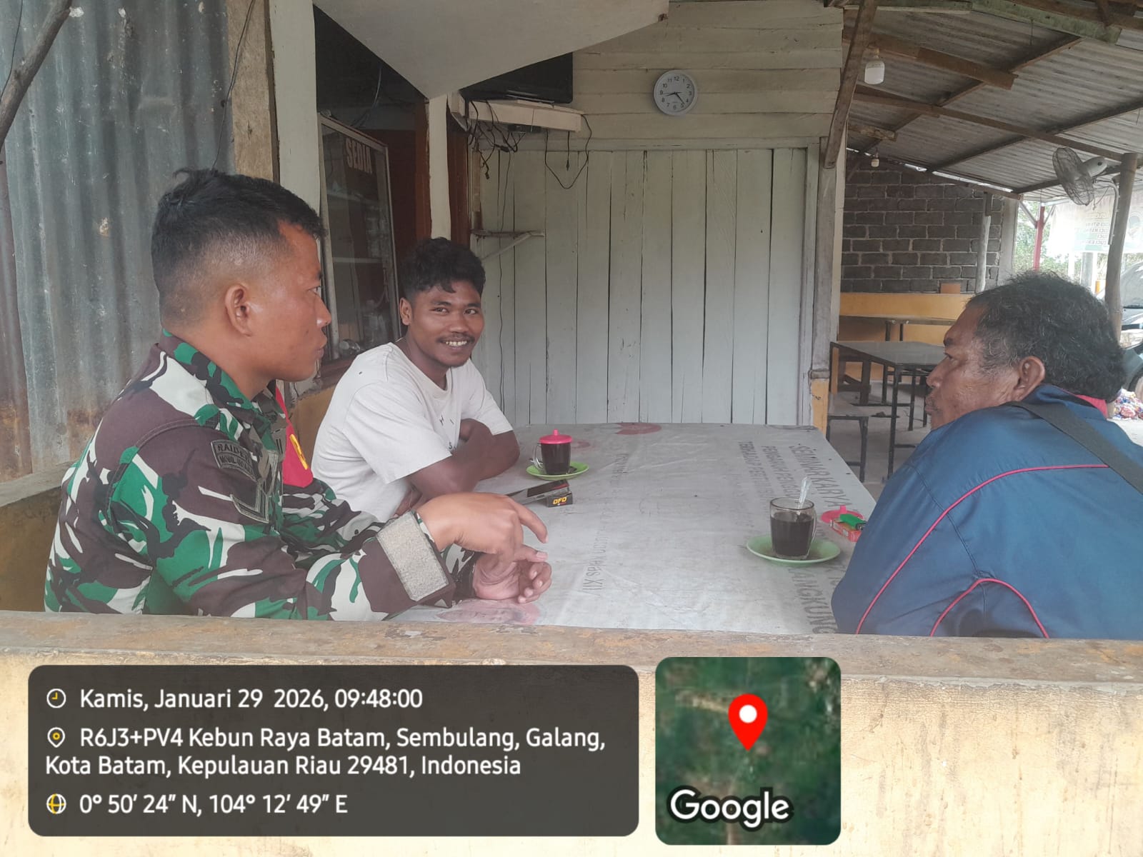 Kegiatan komsos tersebut dilaksanakan pada Kamis (29/1/2026) sekitar pukul 09.30 WIB oleh Babinsa 01 Kelurahan Sembulang, Serda J. Simanjuntak. Kegiatan berlangsung di Kelurahan Sembulang dan menjadi sarana efektif bagi Babinsa untuk menjalin silaturahmi serta membangun kedekatan emosional dengan masyarakat.