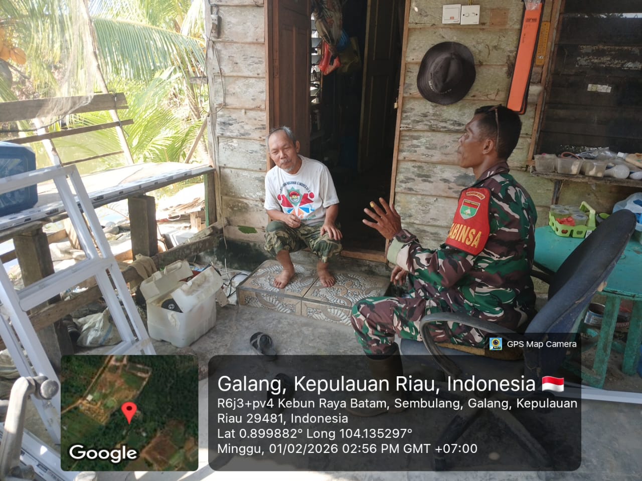 Kodim0316] Babinsa Koramil 04/Galang terus mengintensifkan komunikasi sosial (komsos) dengan masyarakat di wilayah binaan sebagai upaya menjaga keamanan, ketertiban, dan keharmonisan lingkungan. Pada Minggu (1/2/2026), Babinsa Kelurahan Rempang Cate melaksanakan kegiatan komsos bersama warga setempat di Kecamatan Galang, Kota Batam.