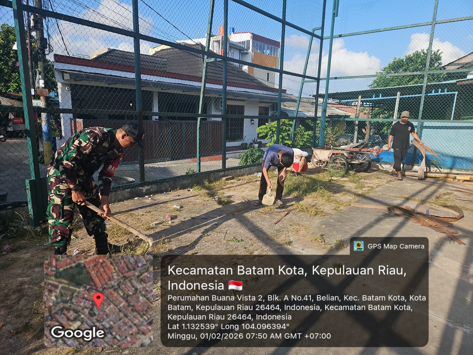 Kodim0316] Babinsa Koramil 03/Nongsa terus menunjukkan peran aktifnya dalam membangun kepedulian sosial dan lingkungan di wilayah binaan. Pada Minggu (1/2/2026) pagi, Babinsa Kelurahan Belian melaksanakan kegiatan gotong royong bersama warga Perumahan Buana Vista Tahap II, RT 005 RW 026, Kecamatan Batam Kota.