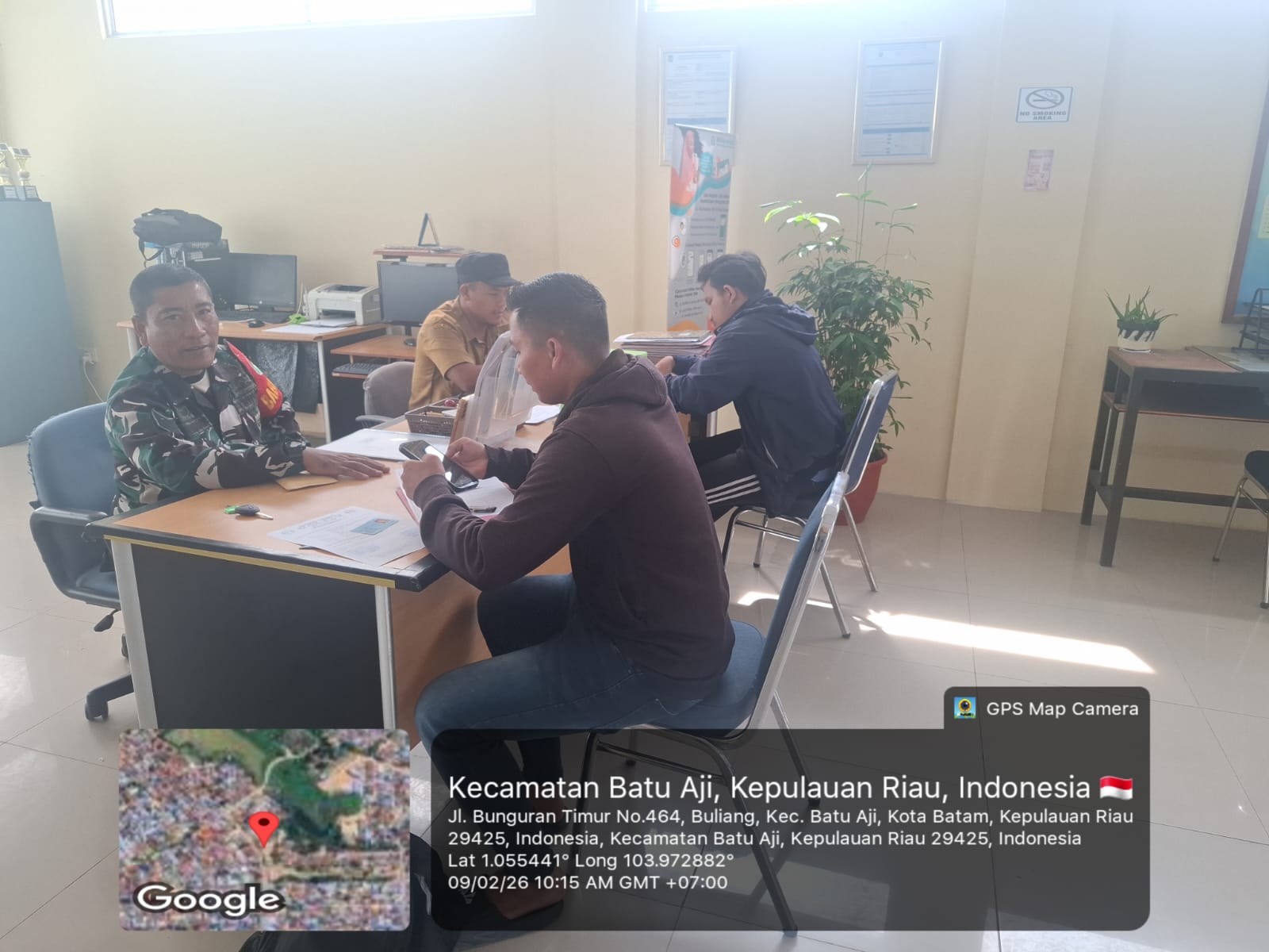 Dalam kegiatan tersebut, Babinsa turut berinteraksi langsung dengan sejumlah warga dan aparatur kelurahan yang sedang melakukan aktivitas pelayanan administrasi. Hadir dalam kegiatan ini antara lain Babinsa 15/Buliang Serka Z. Dalimunthe, Bapak Widada, Saudara Erwin, serta Saudara Syaputra.