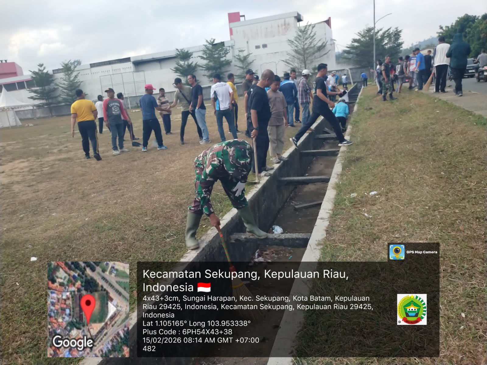 Kodim0316] Babinsa Kelurahan Sungai Harapan, Sertu Zulkifli dari Koramil 02/Sekupang, melaksanakan kegiatan gotong royong bersama masyarakat di Lapangan Bola Kartini, Kelurahan Sungai Harapan, Kecamatan Sekupang, Kota Batam, Minggu (15/2/2026).