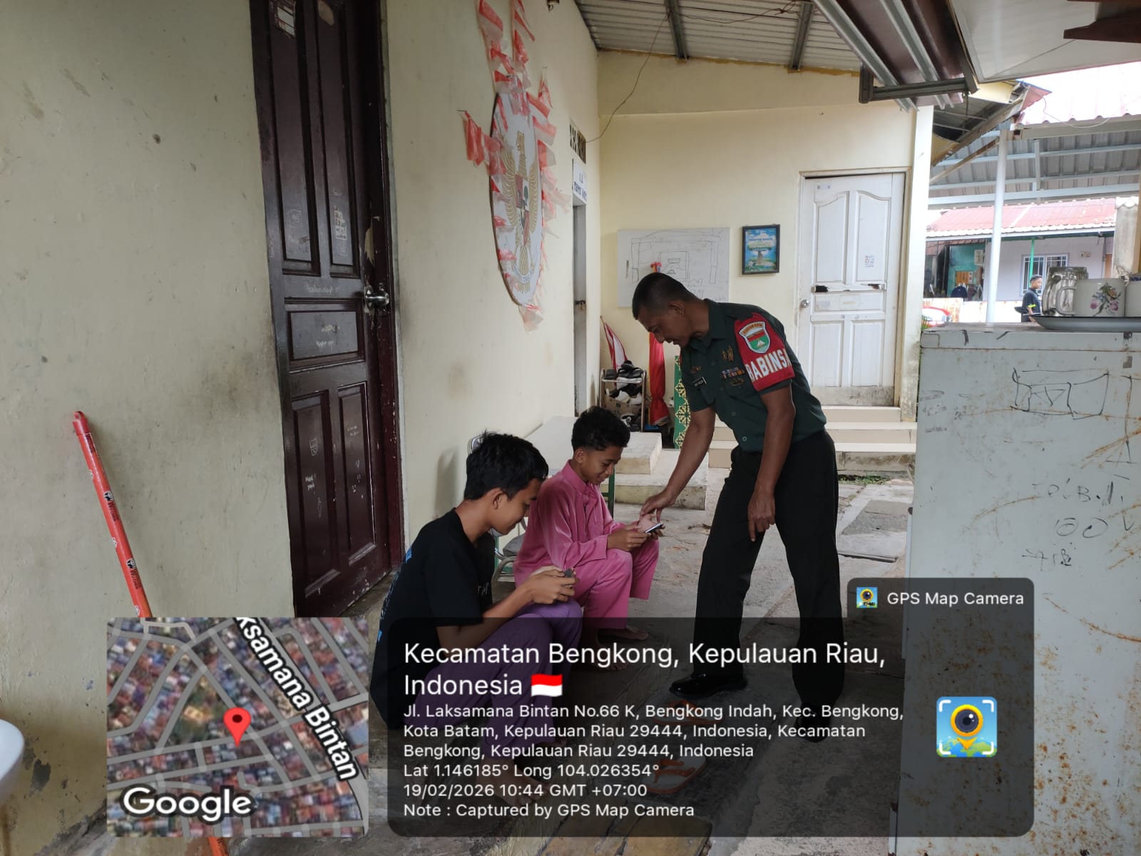 Babinsa 13/Bengkong Indah, Serka Imam, melaksanakan Komsos pada pukul 10.30 WIB dengan dua remaja tingkat SMP, yakni Zacky dan Harun, yang saat itu sedang bermain gim melalui telepon genggam (HP).