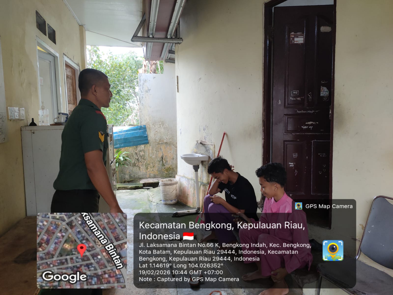 Kodim0316] Bintara Pembina Desa (Babinsa) Koramil 01/LB melaksanakan kegiatan komunikasi sosial (Komsos) bersama anak-anak remaja di wilayah binaan, Kamis (19/2/2026). Kegiatan tersebut berlangsung di RW 01 RT 03, Kelurahan Bengkong Indah, Kecamatan Bengkong, Kota Batam.
