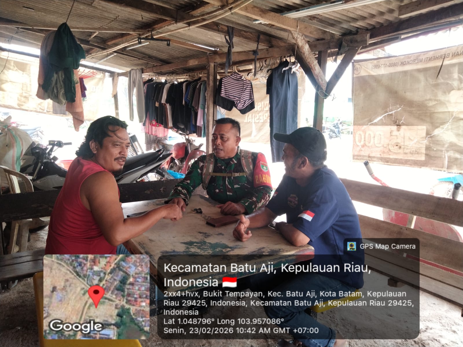 Babinsa Kelurahan Bukit Tempayan, Serka Mukhtar, hadir langsung dalam kegiatan tersebut dan berdialog dengan warga setempat, di antaranya Gorry dan B. Gultom. Suasana pertemuan berlangsung santai dan penuh keakraban.