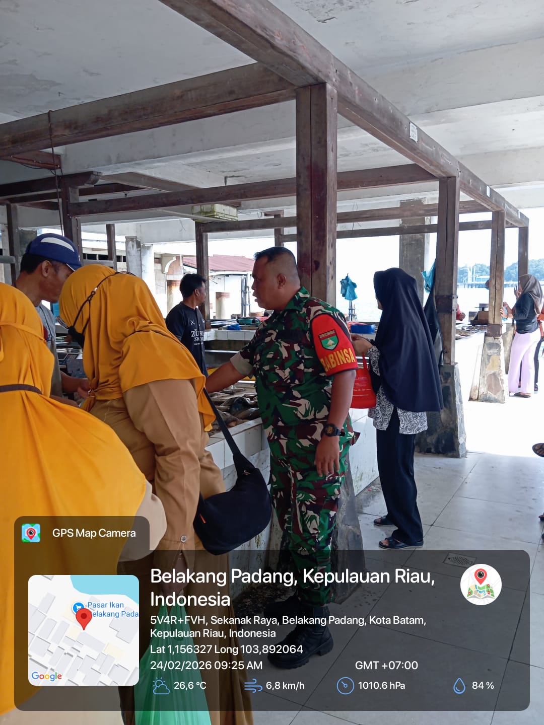 Kodim0316] Babinsa Pemping dari Koramil 05/Belakang Padang melaksanakan kegiatan komunikasi sosial (komsos) bersama para pedagang ikan dan warga binaan di Pasar Induk Kecamatan Belakang Padang, Selasa (24/2/2026) pagi.