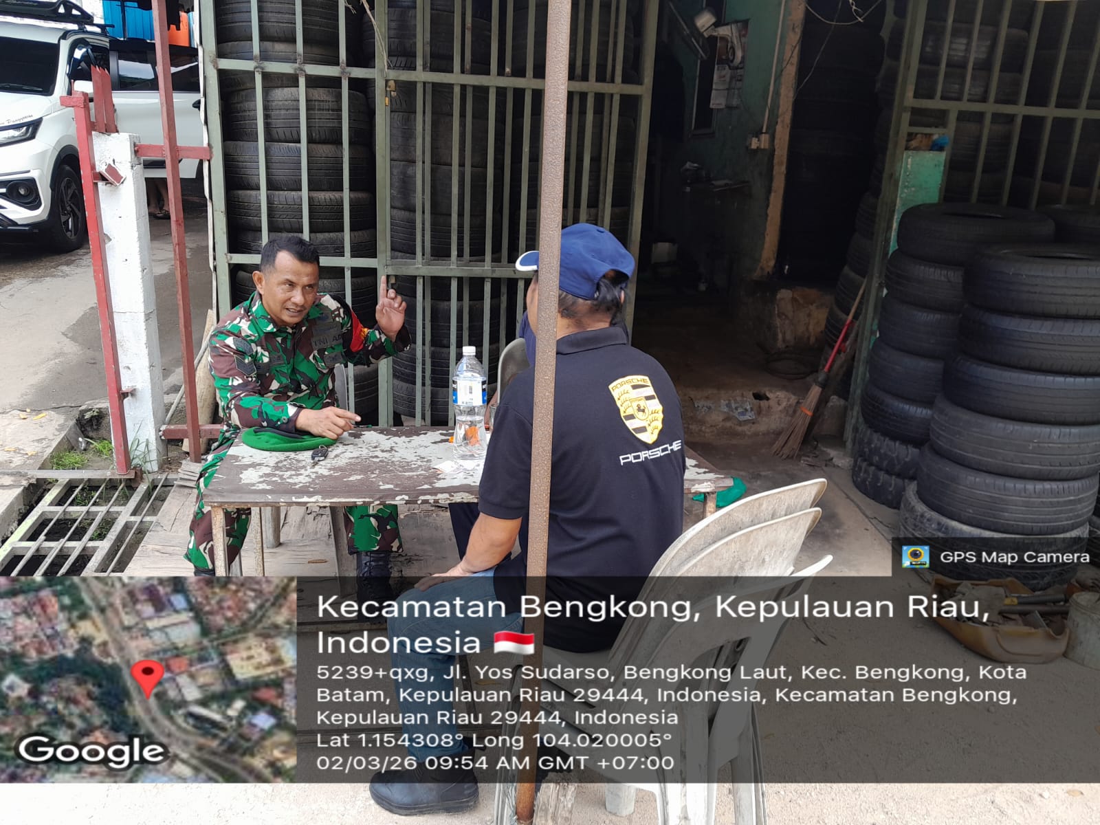 Babinsa Kelurahan Bengkong Laut, Serma Epi Johar, hadir langsung dalam kegiatan tersebut dan berdialog dengan warga binaan, di antaranya Pak Marbun dan Pak Jun selaku pemilik dan pengelola usaha ban seken di lokasi tersebut.